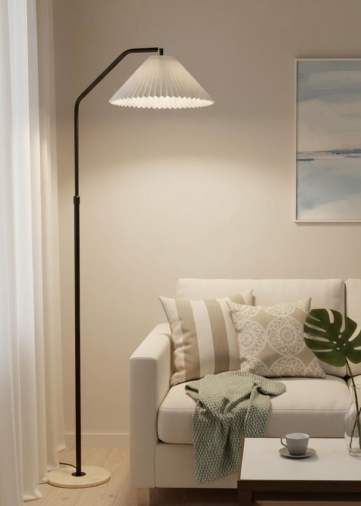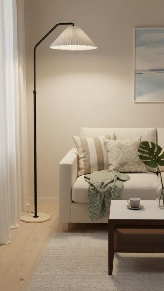 الأبجورة في الصورة أنيقة وبسيطة التصميم، ذات قاعدة طويلة باللون الذهبي تعطيها لمسة فاخرة ودافئة. ذراعها مائل للأمام بانحناءة ناعمة، ما يجعل الضوء يتجه مباشرة نحو منطقة الجلوس. أما الغطاء، فهو باللون الأبيض الكريمي ومصنوع بتصميم مطوي (كسرات ناعمة تشبه المروحة)، مما يوزّع الإضاءة بطريقة مريحة وناعمة على المكان.