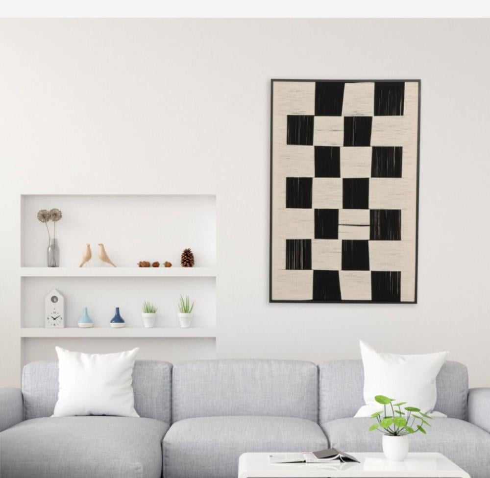 العمل بشكل عام يوحي بتوازن بصري بين التكرار الهندسي الصارم واللمسة العفوية في رسم المربعات السوداء، ليجمع بين النظام والعشوائية في آن واحد. المقاس الطول 120 سم العرض 80 سم