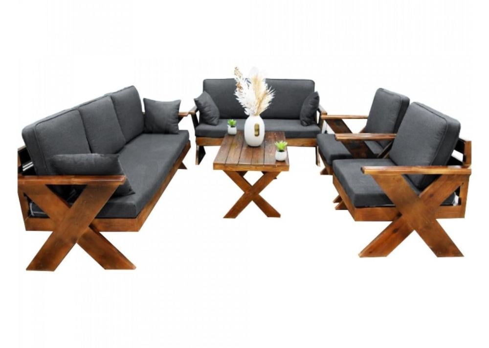 أضف لمسة من الأناقة والفخامة إلى مساحتك الخارجية مع مجموعة الجلوس الخشبية المصممة بعناية لتوفير أقصى درجات الراحة. تأتي هذه المجموعة مع أرائك وطاولة مميزة مع وسائد بلون رمادي داكن أنيق يضفي جوًا من الرقي والهدوء.