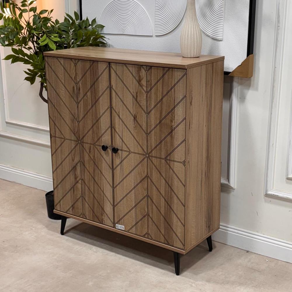 • اللون: خشب طبيعي بدرجة دافئة مزين بنقوش هندسية على شكل حرف V (Chevron pattern) تغطي الواجهة بالكامل