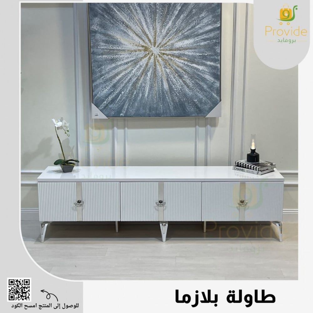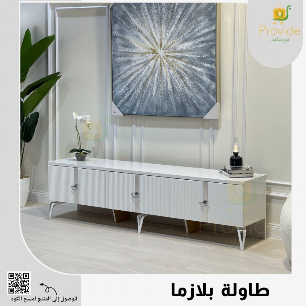 هذه صورة طاولة بلازما بتصميم كلاسيكي فاخر باللون الأبيض، تتميز بأرجل أنيقة تضيف لمسة فنية راقية، مع أبواب أمامية مزودة بمقابض معدنية لامعة تمنحها طابعًا عصريًا ممزوجًا بالكلاسيك. مناسبة لغرف المعيشة الراقية وتوفر مساحة عملية لترتيب الأجهزة والإكسسوارات مع الحفاظ على مظهر أنيق ومميز.