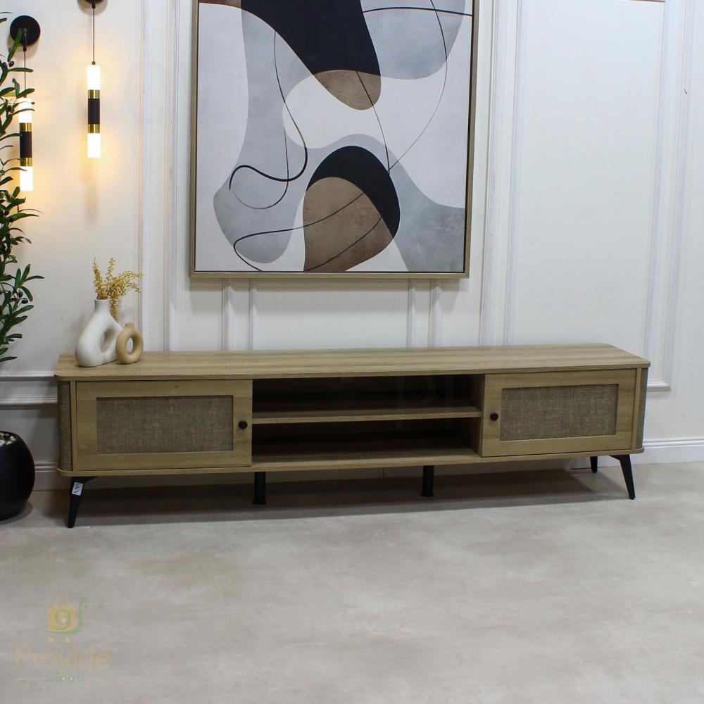 طاولة بلازما بتصميم أنيق وعصري مصنوعة من الخشب الفاخر بلون طبيعي يضفي لمسة دفء على غرفة المعيشة. تتميز بسطح واسع لوضع شاشة التلفاز والديكورات، مع وجود رفوف وسطية عملية لتنظيم الأجهزة الإلكترونية مثل الرسيفر أو أجهزة الألعاب. كما تحتوي على أبواب جانبية منزلقة تضيف لمسة جمالية وتوفر مساحة تخزين مغلقة لحفظ الكتب أو المستلزمات بعيدًا عن الفوضى.