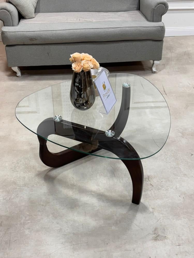الطاولة الظاهرة في الصورة تتميز بتصميم عصري أنيق يجمع بين البساطة والفخامة. سطحها مصنوع من الزجاج الشفاف ذي حواف بيضاوية ناعمة، مما يمنحها مظهراً خفيفاً ومفتوحاً في الفراغ. القاعدة تأتي بشكل هندسي مميز باللون الأسود، على شكل إطار منحني على هيئة حرف (U) عريض يضيف لمسة فنية عصرية ويمنح الطاولة ثباتاً وأناقة في آن واحد.