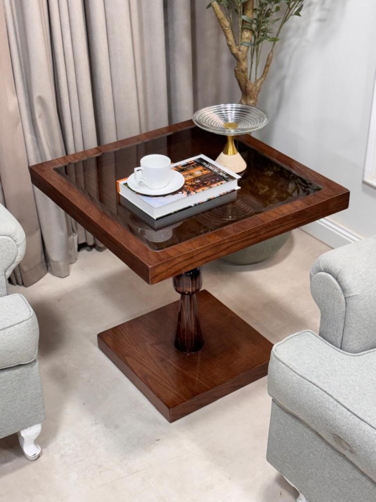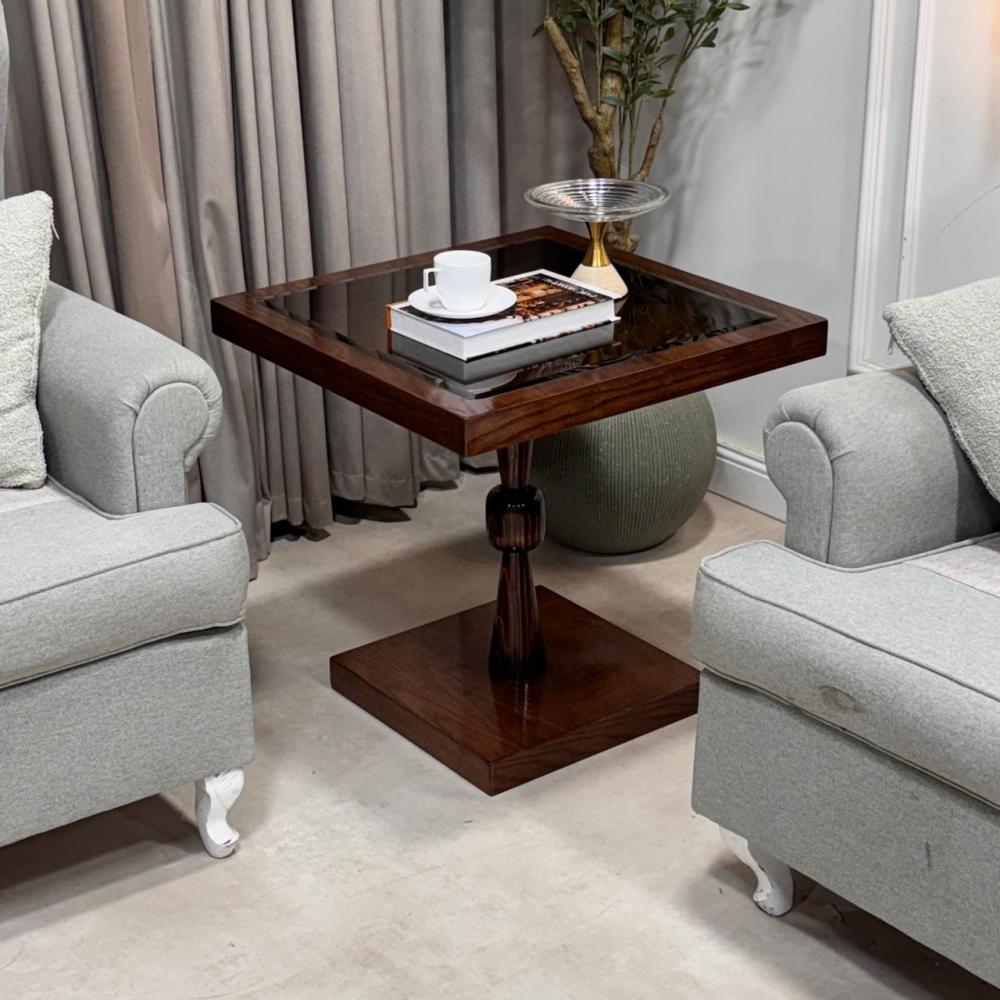 طاولة جانبية بتصميم عصري أنيق، تجمع بين الفخامة والبساطة، مصنوعة من الخشب الطبيعي بلون الجوز الداكن مع سطح زجاجي شفاف يبرز جمال الخشب أسفله.
