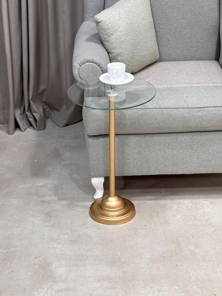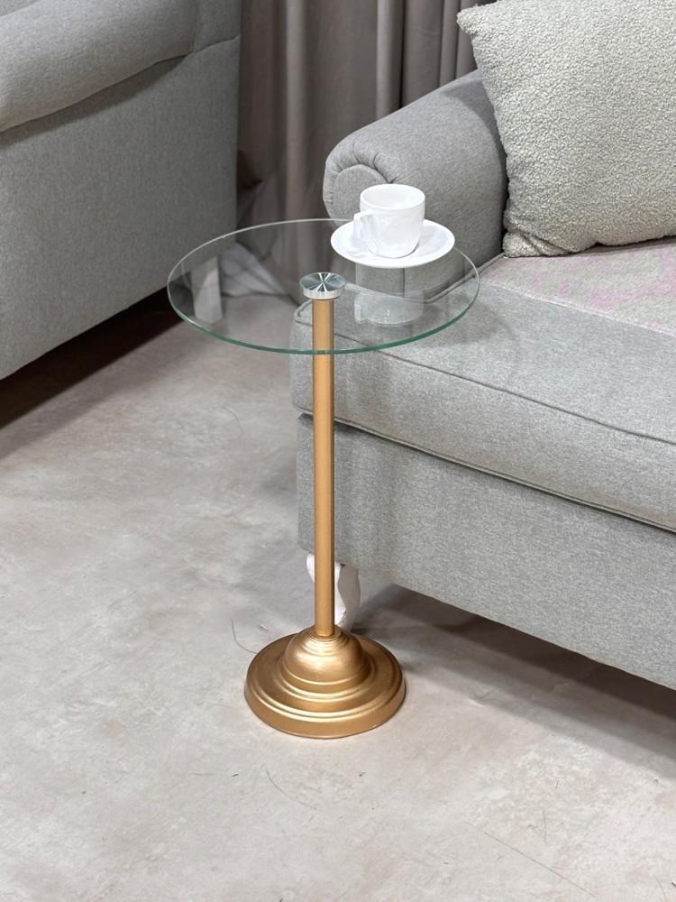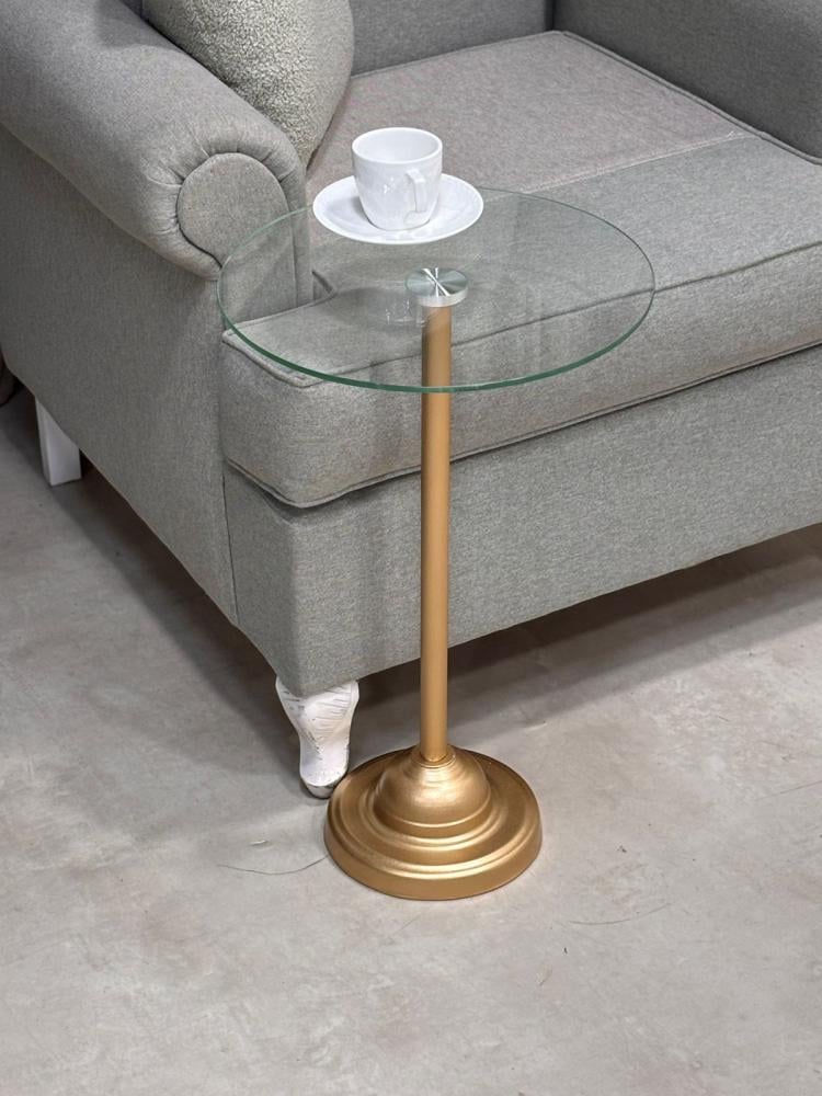 طاولة جانبية بتصميم عصري أنيق، تتميز بسطح دائري من الزجاج الشفاف يمنحها خفة وجاذبية، مع قاعدة معدنية باللون الذهبي الفخم تضيف لمسة من الفخامة والرقي على المكان. العمود النحيف المتصل بالقاعدة يعطيها طابعاً بسيطاً وعملياً، مع ثبات قوي على الأرض.