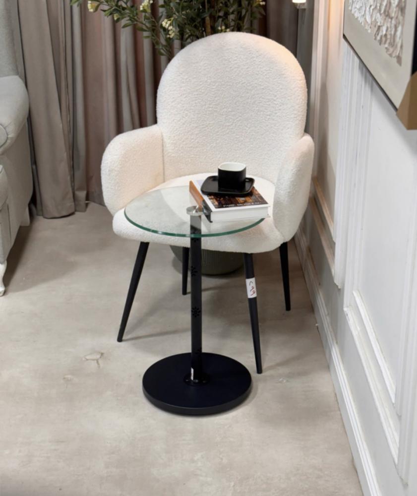 الطاولة في الصورة طاولة خدمة صغيرة ذات تصميم عصري وبسيط. سطحها دائري مصنوع من الزجاج الشفاف، مدعوم بقاعدة عمودية أسطوانية سوداء اللون. القاعدة السفلية للطاولة دائرية وعريضة باللون الأسود أيضًا لتمنحها الثبات. الطاولة أنيقة وخفيفة المظهر، وتناسب الاستخدام بجانب الكرسي أو الأريكة لوضع فنجان قهوة أو أشياء صغيرة.