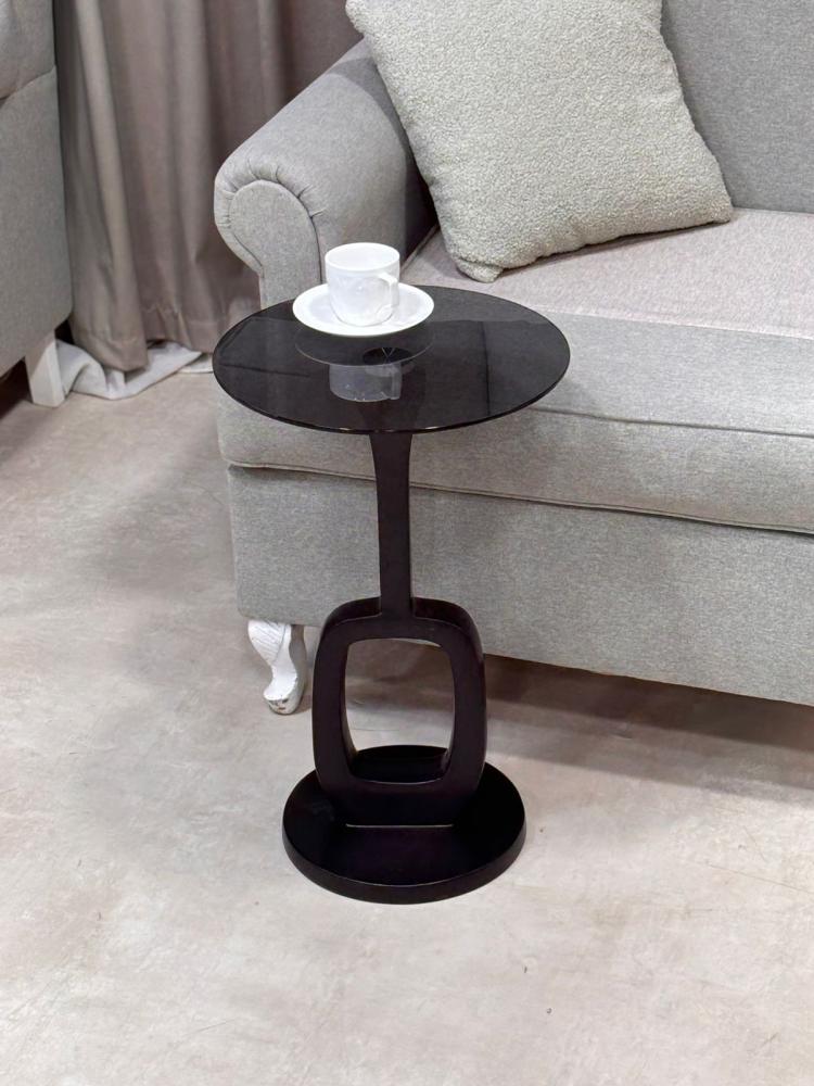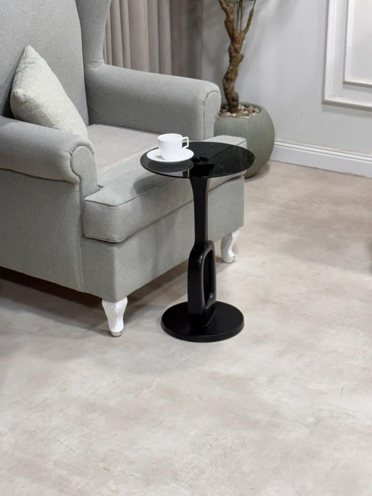 تأتي بسطح دائري من الزجاج الأسود اللامع يضفي عمقًا راقيًا، مع قاعدة معدنية بتصميم هندسي فريد باللون الأسود المطفي يمنحها مظهرًا متوازنًا بين الكلاسيك والمودرن.