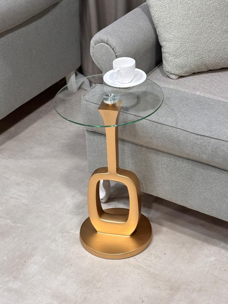 يأتي سطحها من الزجاج الشفاف الدائري يمنحها خفة في المظهر وأناقة في التفاصيل، مع قاعدة معدنية بلون ذهبي مطفي بتصميم هندسي مميز يضفي لمسة فنية راقية على المكان.