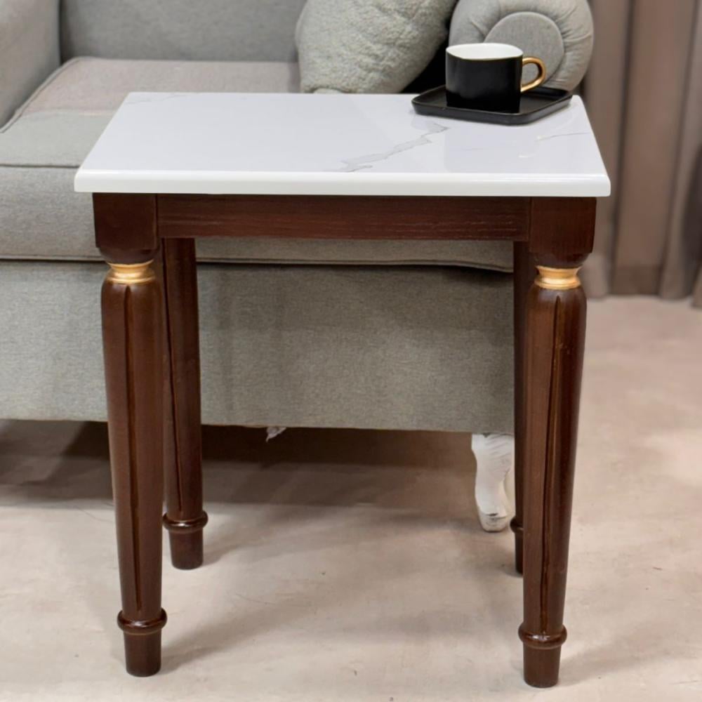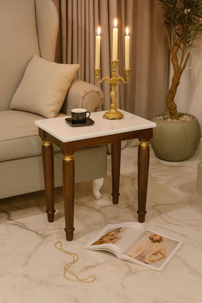 طاولة جانبية بتصميم يجمع بين البساطة والأناقة. تتميز بسطح مصنوع من خشب شبه رخام باللون الأبيض مع عروق ناعمة تضيف لمسة فاخرة وعصرية، بينما القاعدة والأرجل مصنوعة من الخشب الطبيعي بلونه البني الدافئ مع تفاصيل زخرفية رفيعة تمنحها مظهراً كلاسيكياً أنيقاً.