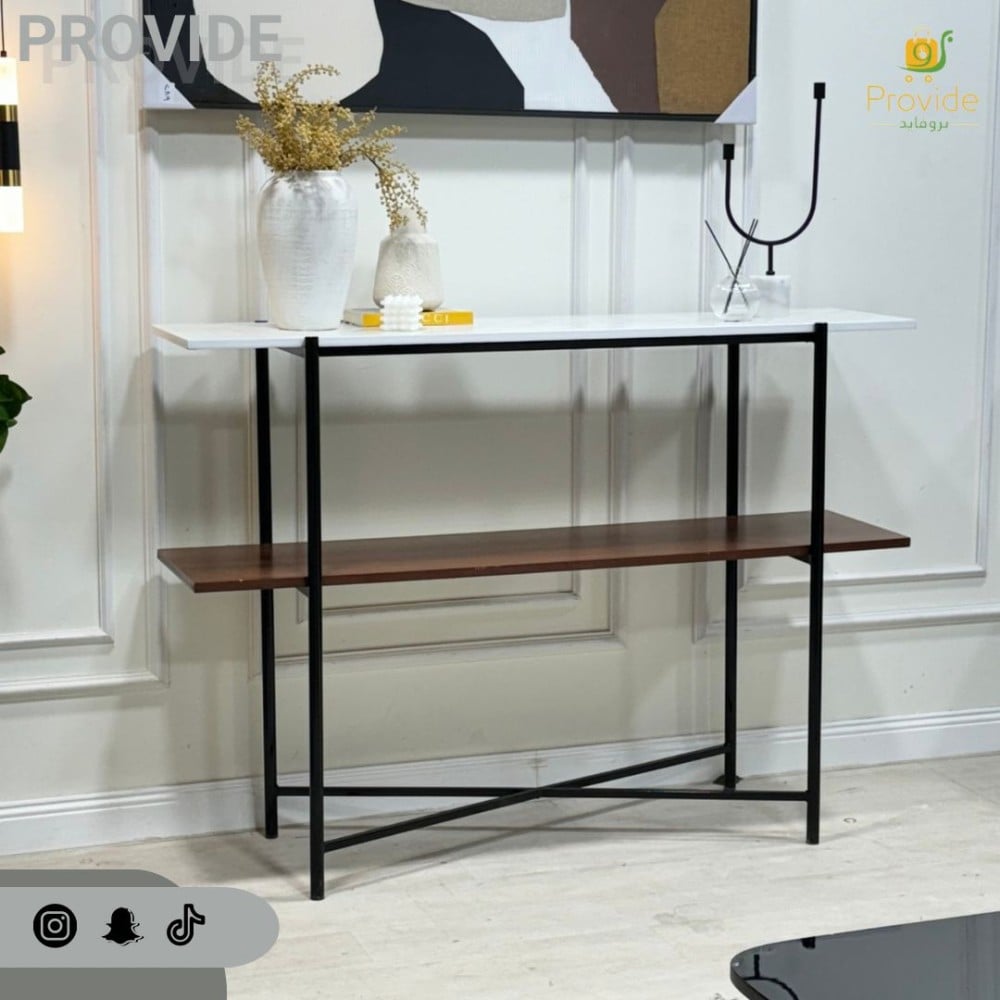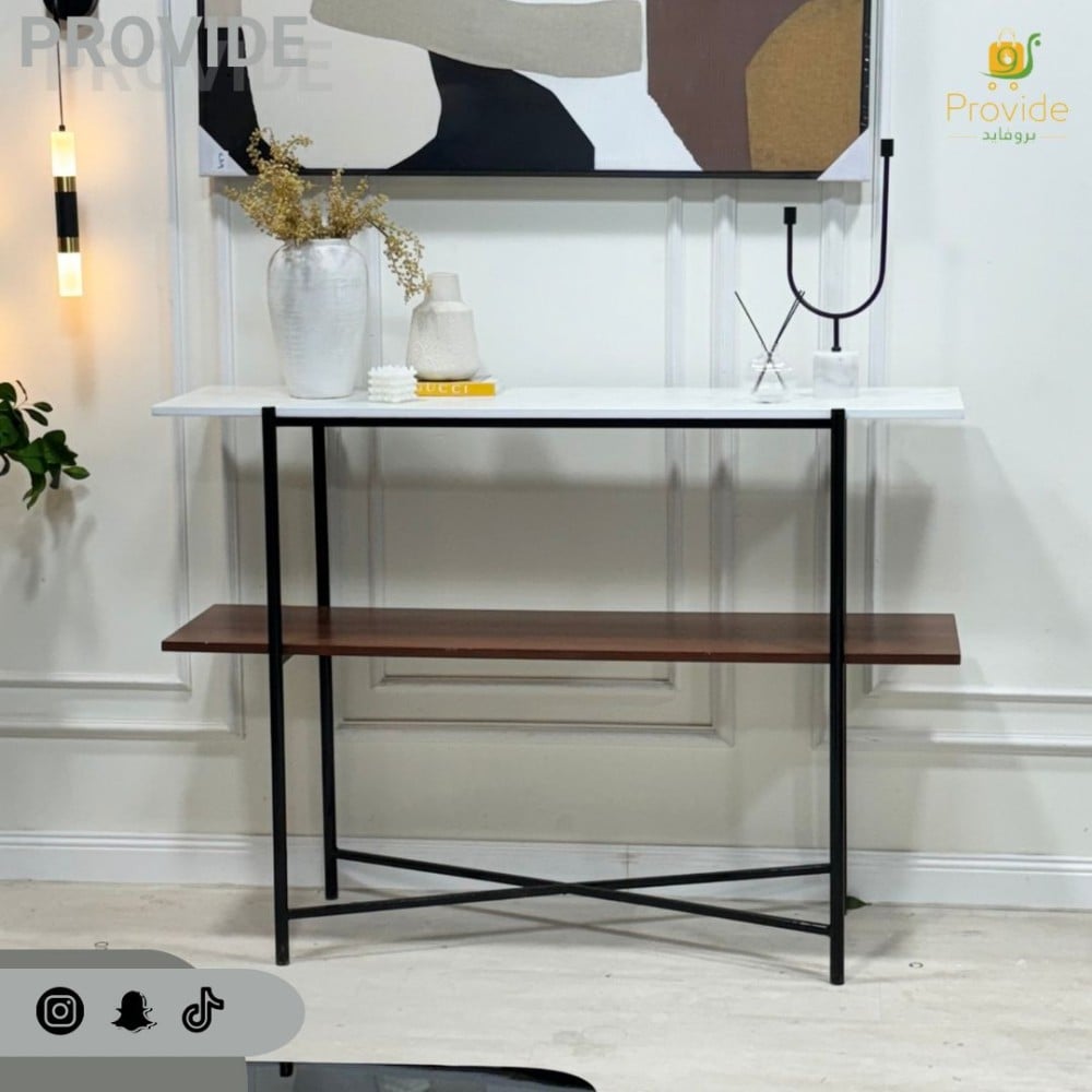 طاولة كونسول بتصميم عصري بسيط يجمع بين الأناقة والعملية، تتميز بسطح علوي أبيض ناعم يشبه الرخام، مع رف سفلي بلون خشبي دافئ لإضافة لمسة طبيعية. تدعم الطاولة قاعدة معدنية باللون الأسود بتصميم هندسي خفيف يعزز الاستقرار دون التأثير على خفة المظهر.