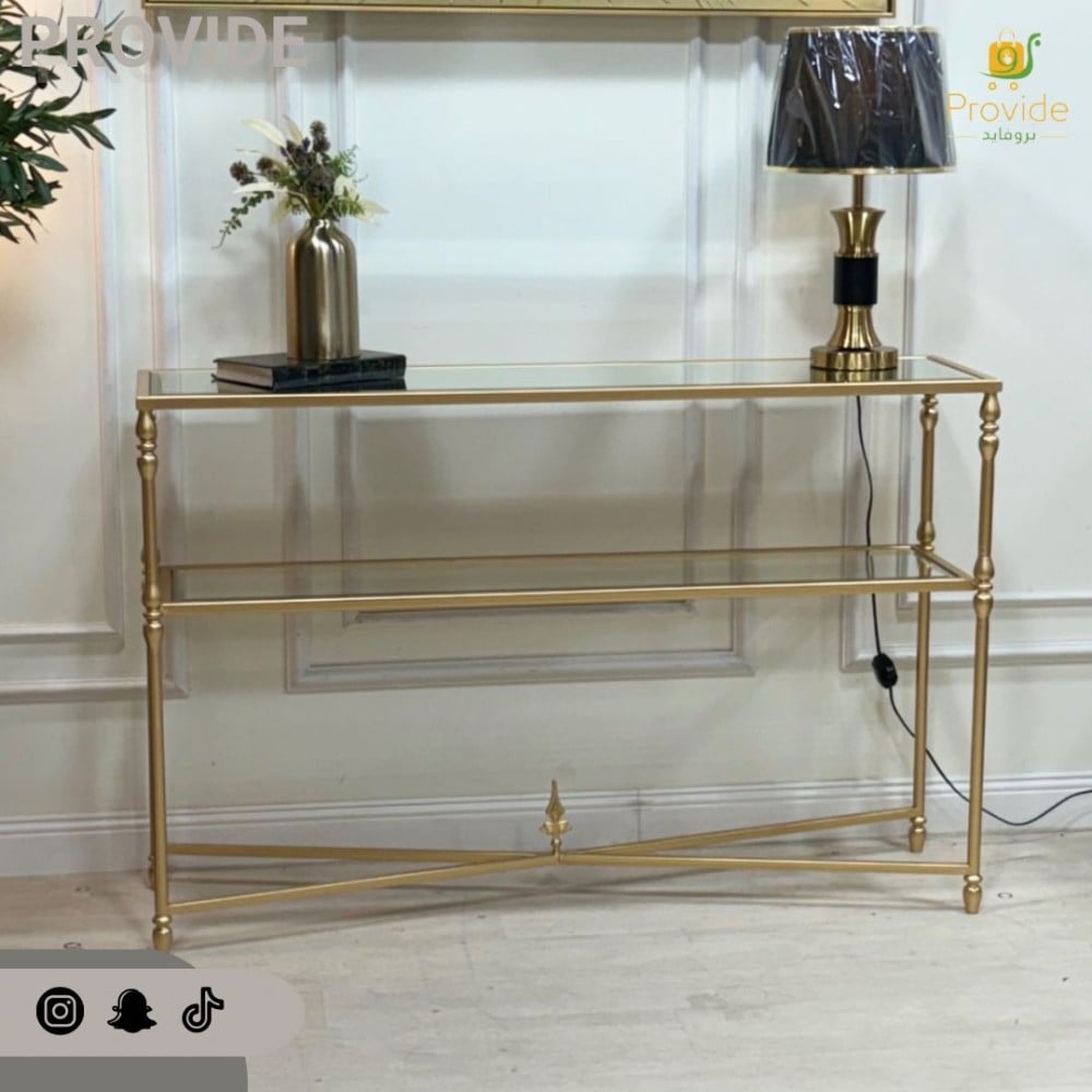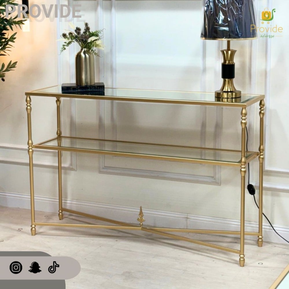 اطاولة كونسول أنيقة بتصميم فاخر يجمع بين الهيكل المعدني المطلي باللون الذهبي والسطح الزجاجي الشفاف، ما يمنحها لمسة فخامة مناسبة للمداخل الراقية أو المساحات العصرية.