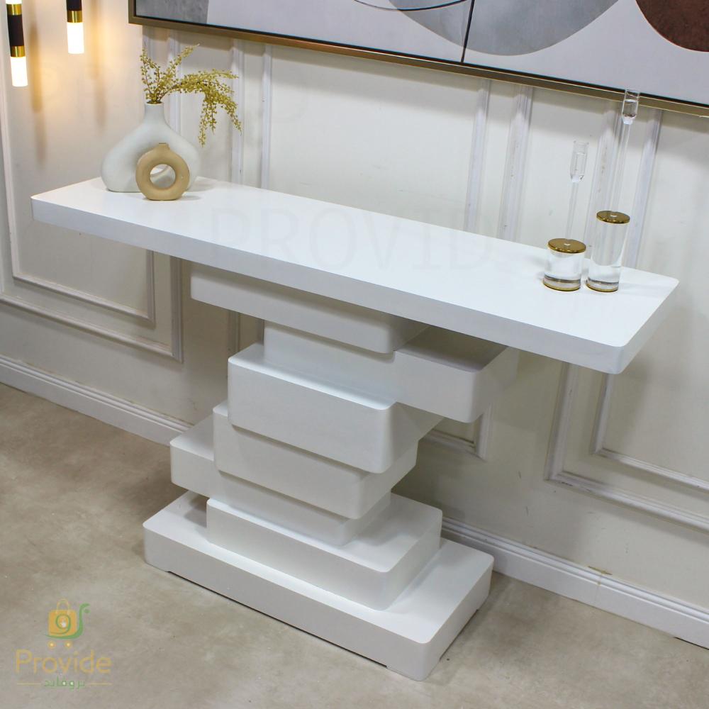 طاولة مدخل عصرية بتصميم هندسي فريد من نوعه، مصنوعة من مواد عالية الجودة مع تشطيب أبيض أنيق. تتميز بقاعدة مكونة من عدة مستطيلات متراكبة بشكل متدرج، مما يعطي الطاولة مظهراً مميزاً وجذاباً يلفت الأنظار. هذه الطاولة مثالية لوضع الديكورات أو المفروشات الخفيفة، وتضيف لمسة عصرية راقية لأي مدخل أو ركن في المنزل.