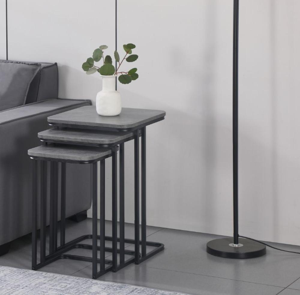 • المكونات: يتكون من ثلاث طاولات متداخلة بأحجام مختلفة يمكن إدخالها تحت بعضها لتوفير المساحة.