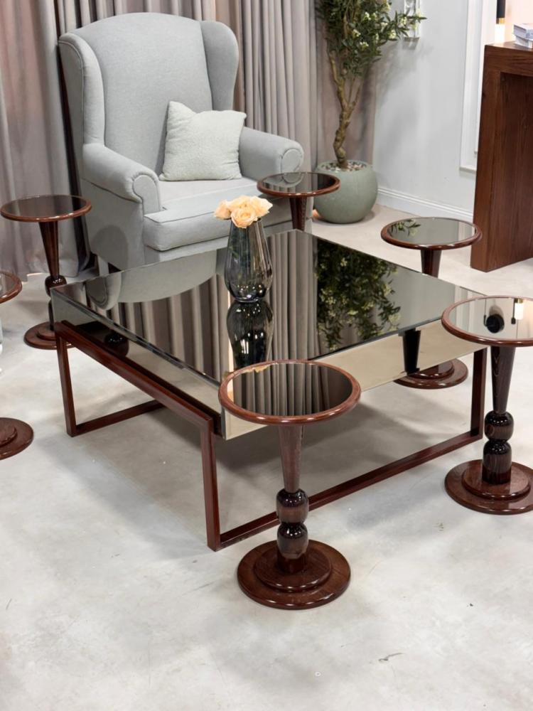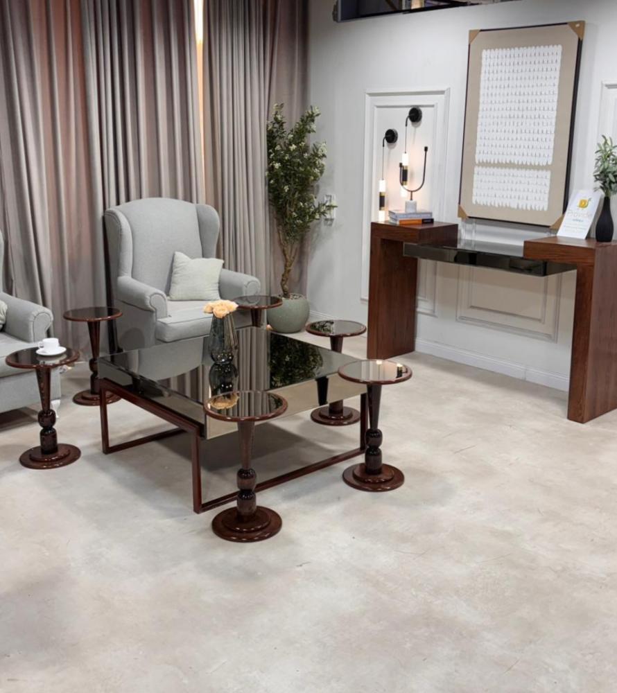 طقم طاولات بتصميم كلاسيك عصري فاخر يجمع بين الفخامة والدفء في التفاصيل. يتكوّن الطقم من طاولة وسط رئيسية وأربع طاولات جانبية بتصميم دائري أنيق يضفي على المكان توازناً بصرياً ولمسة راقية.