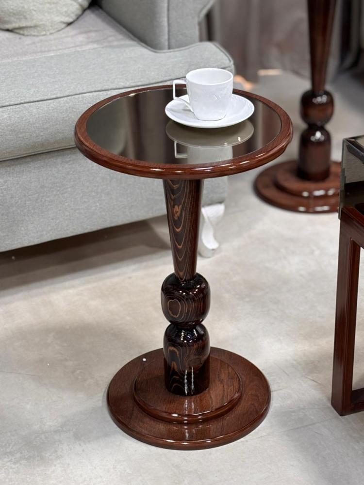 السطح مصنوع من زجاج سكريت مدخن يمنح انعكاساً جميلاً وإحساساً بالفخامة، فيما تأتي القاعدة من خشب طبيعي بلون بني غامق بتفاصيل منحوتة تضيف طابعاً كلاسيكياً راقياً يتماشى مع مختلف أنماط الديكور.
