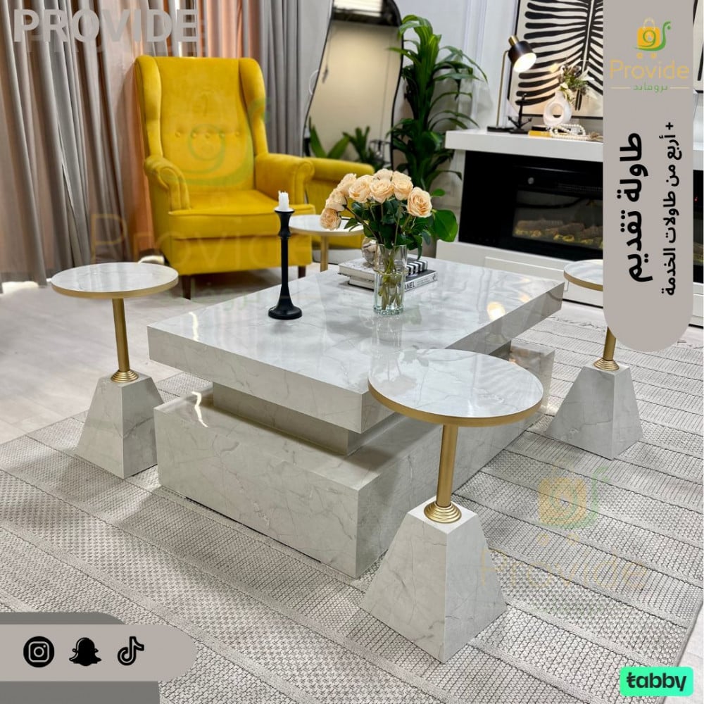 أضف لمسة من الفخامة والتميز إلى منزلك مع طقم طاولات التقديم المكون من طاولة كبيرة وأربع طاولات خدمة، بتصميم سطح من بديل الرخام الأبيض بقاعدة معدنية باللون الذهبي بتصميم عصري وأنيق. هذا الطقم مثالي لتزيين غرفة المعيشة أو استخدامه لتقديم الضيافة في المناسبات، حيث يجمع بين الجمالية والوظيفية.