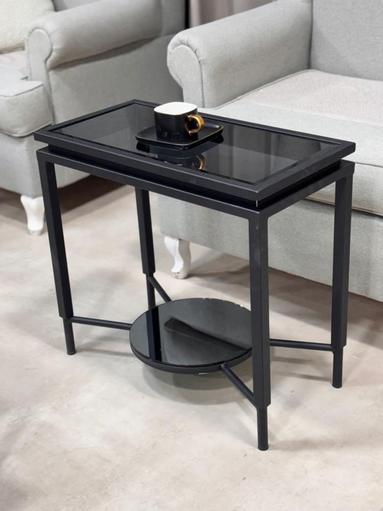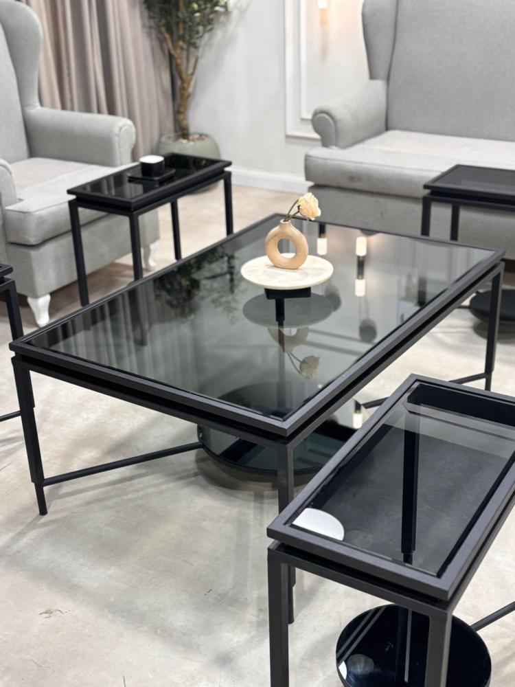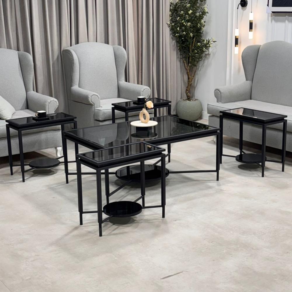 - الخامة والتصميم: الطاولات مصنوعة من هيكل معدني باللون الأسود مع أسطح علوية من الزجاج الأسود العاكس، مما يعطيها لمسة فاخرة وعصرية.