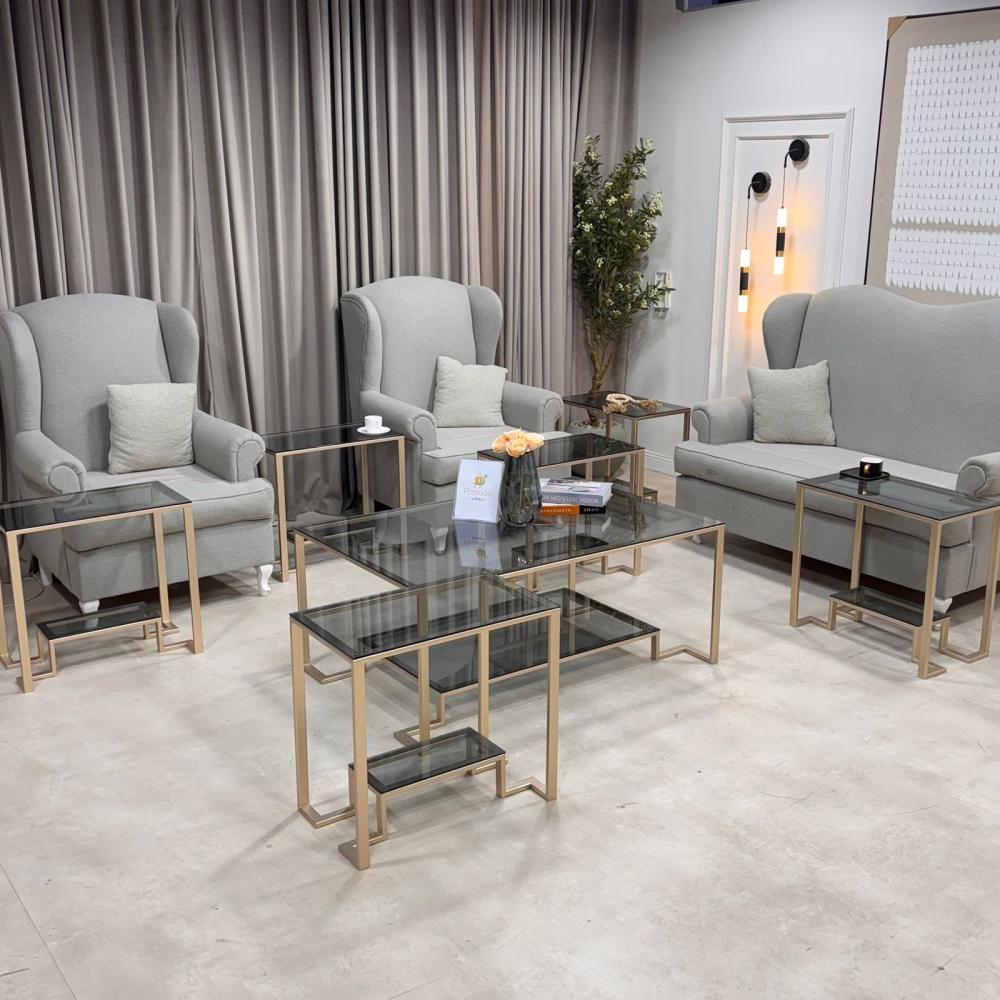 طقم طاولات مودرن بتصميم عصري أنيق يجمع بين الفخامة والبساطة الهندسية. يتكوّن الطقم من طاولة وسط رئيسية وطاولات جانبية متعددة الاستخدام، بتصميم متناسق يجعلها خياراً مثالياً لغرف المعيشة الراقية.