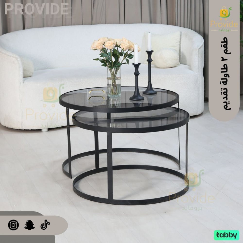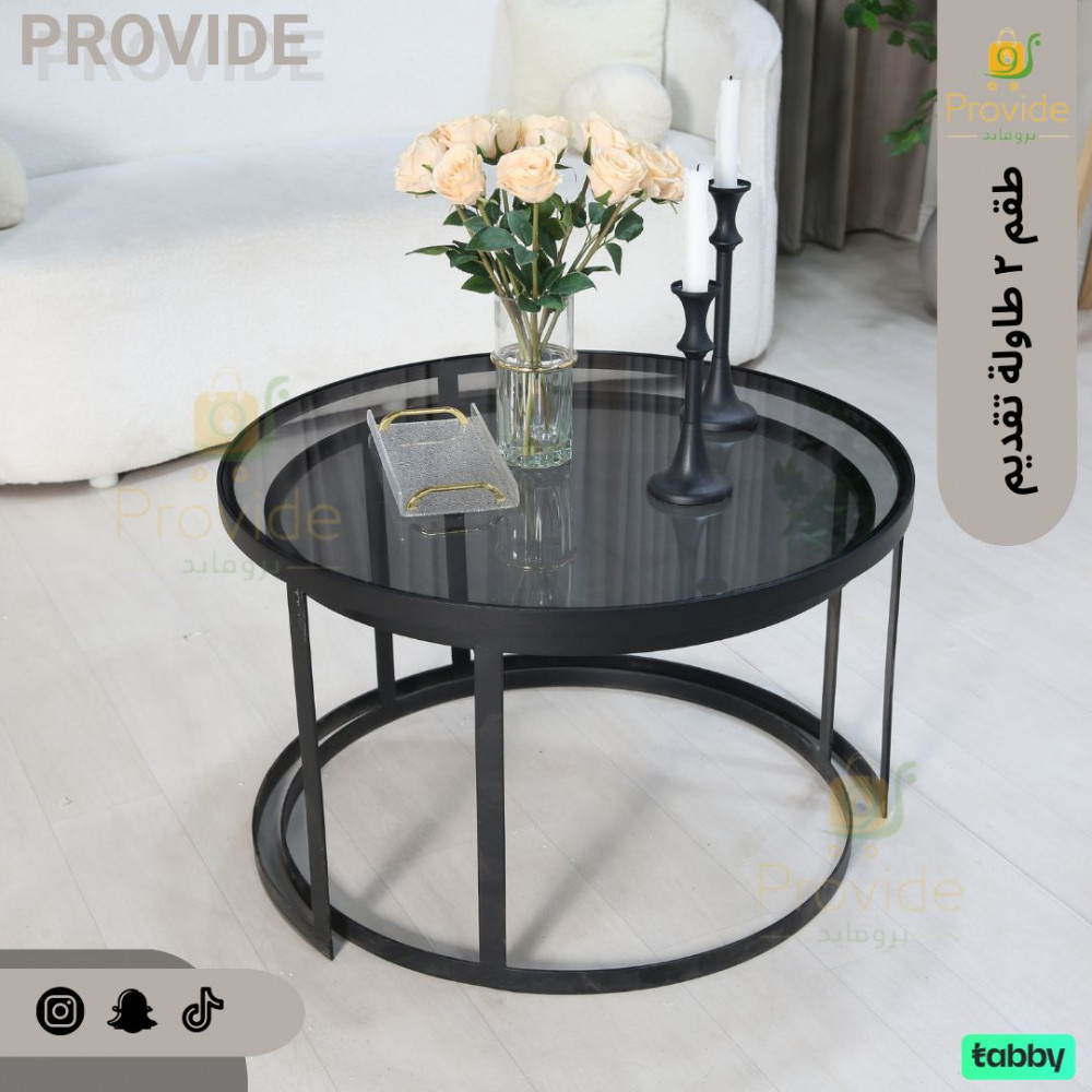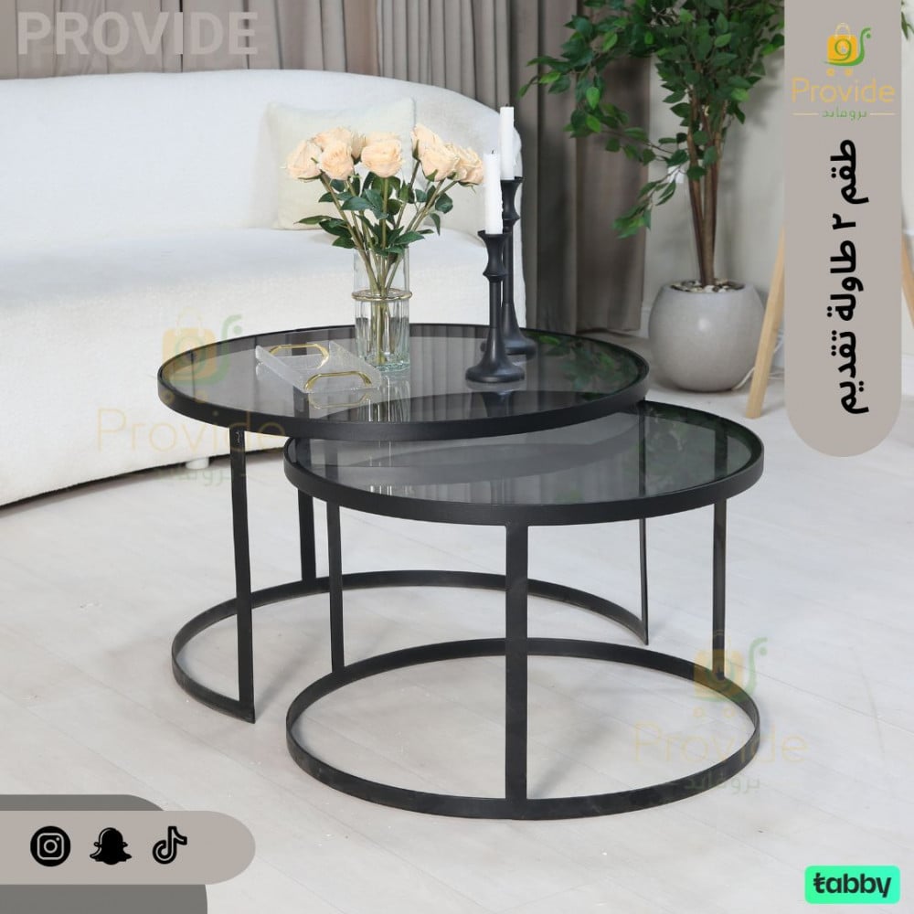 أضف لمسة من الأناقة والتميز إلى منزلك مع طقم طاولات التقديم المكون من طاولتين بأحجام مختلفة، بتصميم سطح زجاجي وإطار حديدي بتصميم أنيق وعصري. هذا الطقم مثالي لتزيين غرفة المعيشة أو استخدامه كطاولات تقديم لتوفير المساحة والأناقة.