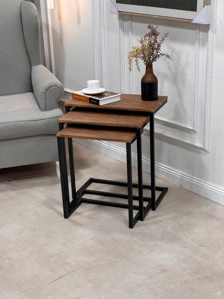 طقم طاولات خدمة (3 قطع) بتصميم عصري أنيق، يجمع بين الخشب الطبيعي باللون البني الدافئ مع قاعدة معدنية باللون الأسود لإطلالة عصرية ومتناسقة.