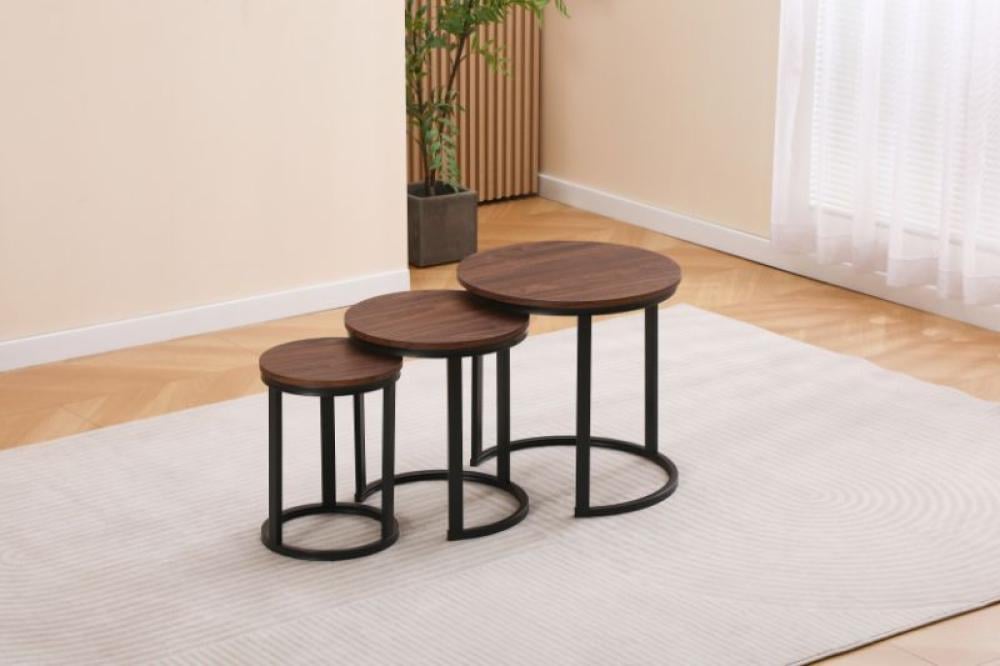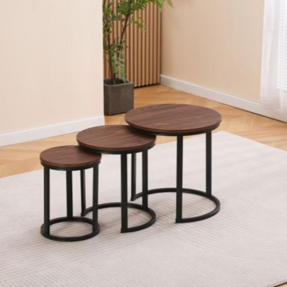 - الخامة: سطح الطاولات مصنوع من خشب بلون بني طبيعي دافئ، بينما القاعدة من معدن أسود متين على شكل دائري يمنح ثباتًا وانسيابية.
