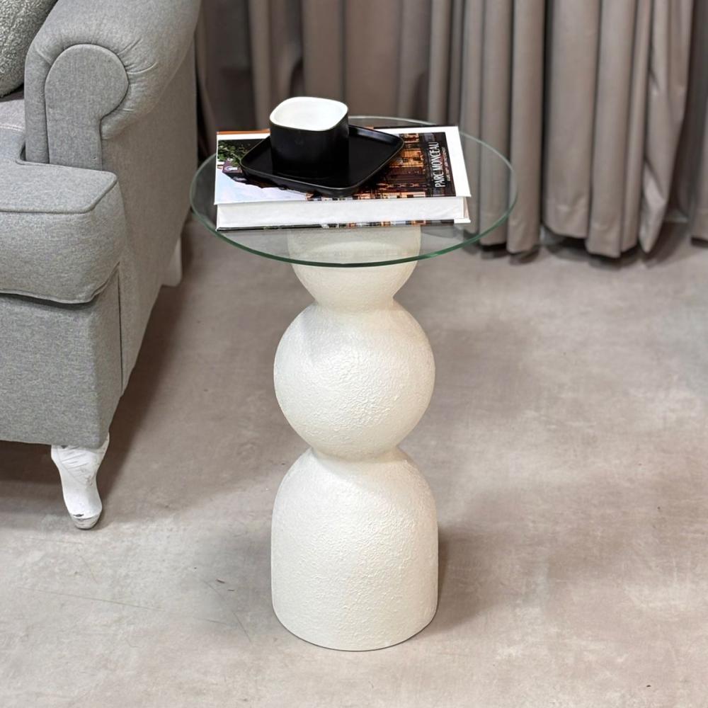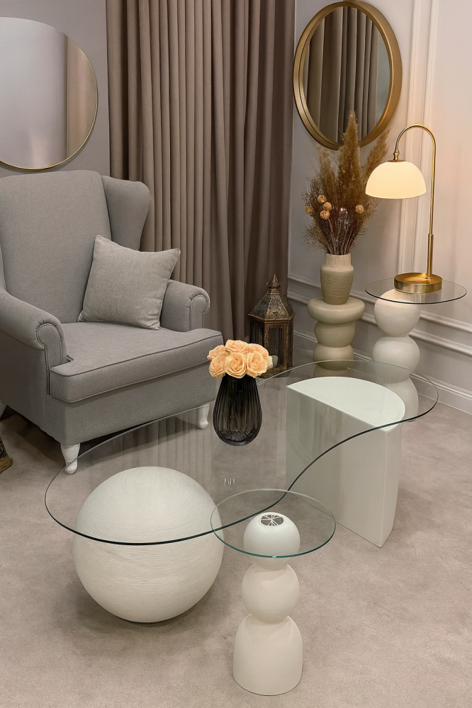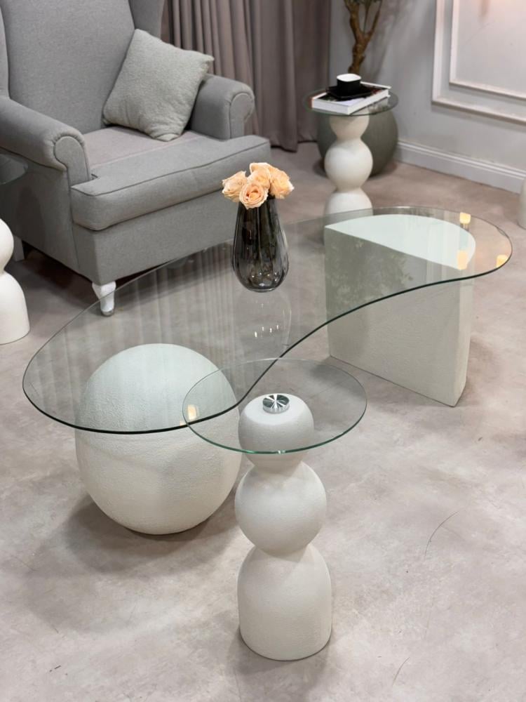 هذا الطقم الراقي مكوّن من طاولات بتصميم عصري مبتكر بقاعدة من رخام صناعي فاخر يجمع بين القوة والجمال. السطح العلوي مصنوع من زجاج شفاف مقوّى يبرز روعة القاعدة المنحوتة بأشكال هندسية فنية انسيابية.