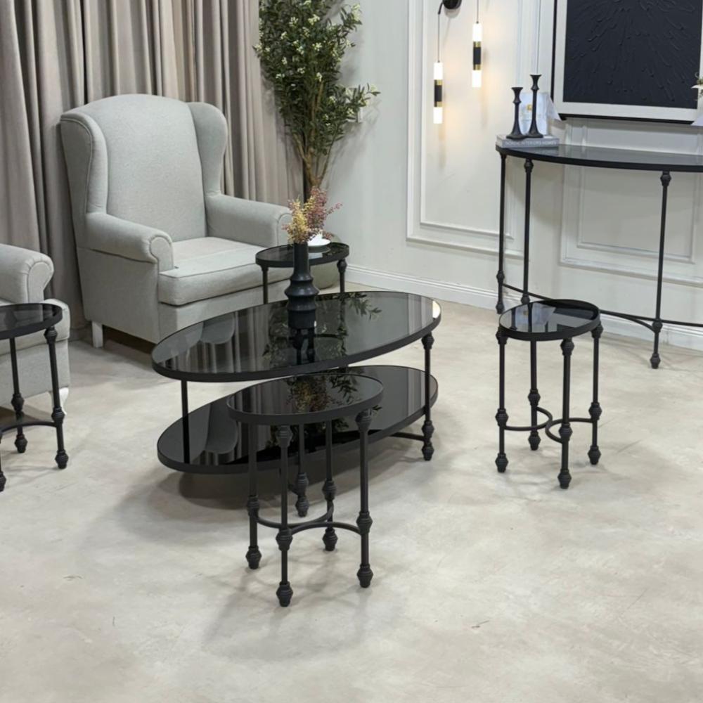 طقم طاولة مع 4 خدمة عصري بتصميم أنيق يجمع بين الزجاج العاكس المعدني والإطار الحديدي الفاخر. الطاولات تأتي بشكل بيضاوي متدرج يمنح ديكور منزلك لمسة فنية مميزة ويضيف رحابة للمكان.