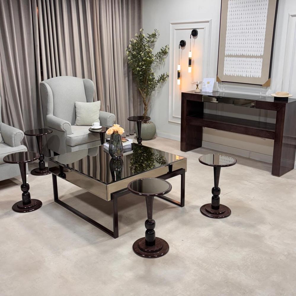 طقم طاولات راقٍ يجمع بين البساطة والفخامة، يتكون من طاولة وسط بتصميم عصري بسطح زجاجي عاكس يمنح المكان لمسة فخمة، مع عدة طاولات جانبية صغيرة بتصميم مميز وقاعدة خشبية أنيقة باللون البني الغامق.