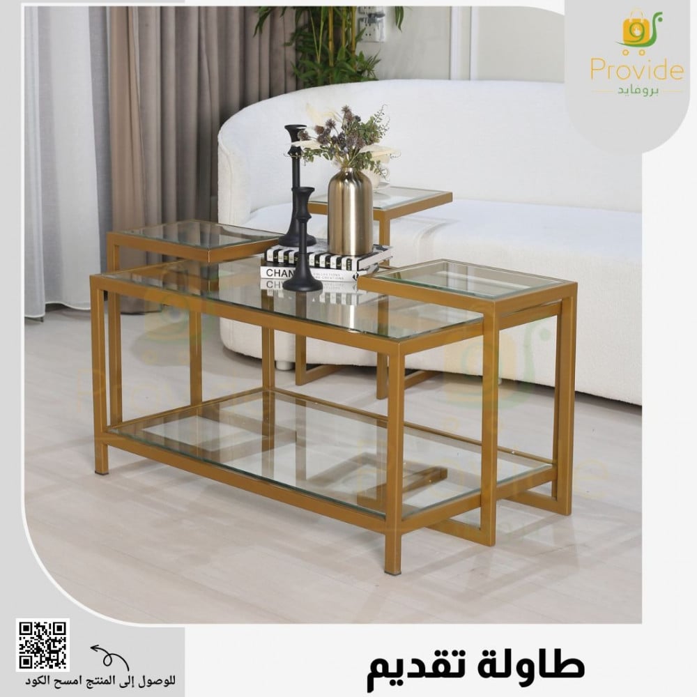 تتميز الطاولة بسطحين زجاجيين شفافين (علوي وسفلي)، مما يتيح استخداماً عملياً ومساحة عرض إضافية للديكور أو أدوات الضيافة، بينما يعزز الإطار المعدني بلونه الذهبي الفاخر من جاذبية التصميم.