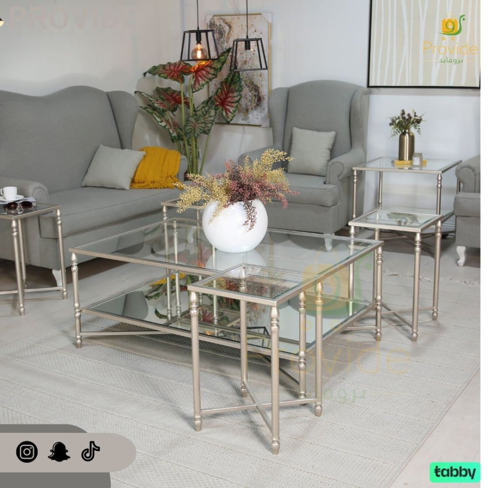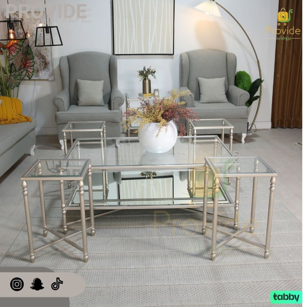 استلم طقم الطاولة المميز من مكتب الشحن وارتقِ بديكور منزلك مع هذا الطقم الفاخر الذي يجمع بين التصميم العصري والأناقة الكلاسيكية. يتميز الطقم بسطح زجاجي ومرايا مع أعمدة من الحديد المتين، مما يضيف لمسة من الفخامة إلى غرفة المعيشة. يتضمن الطقم طاولة تقديم كبيرة وأربع طاولات خدمة متناسقة، مما يجعله مثاليًا لتقديم الضيافة أو كمساحة إضافية لوضع المقتنيات.