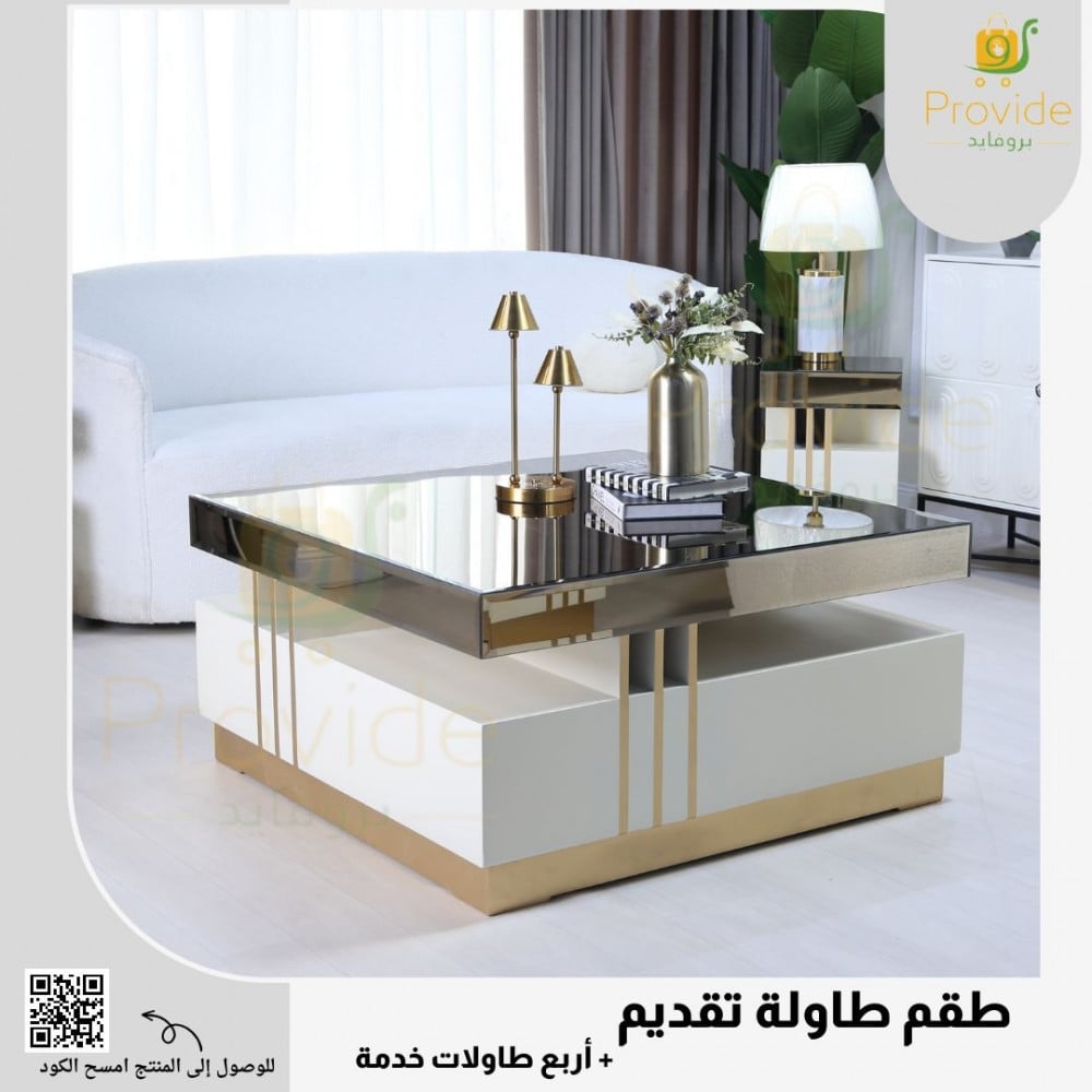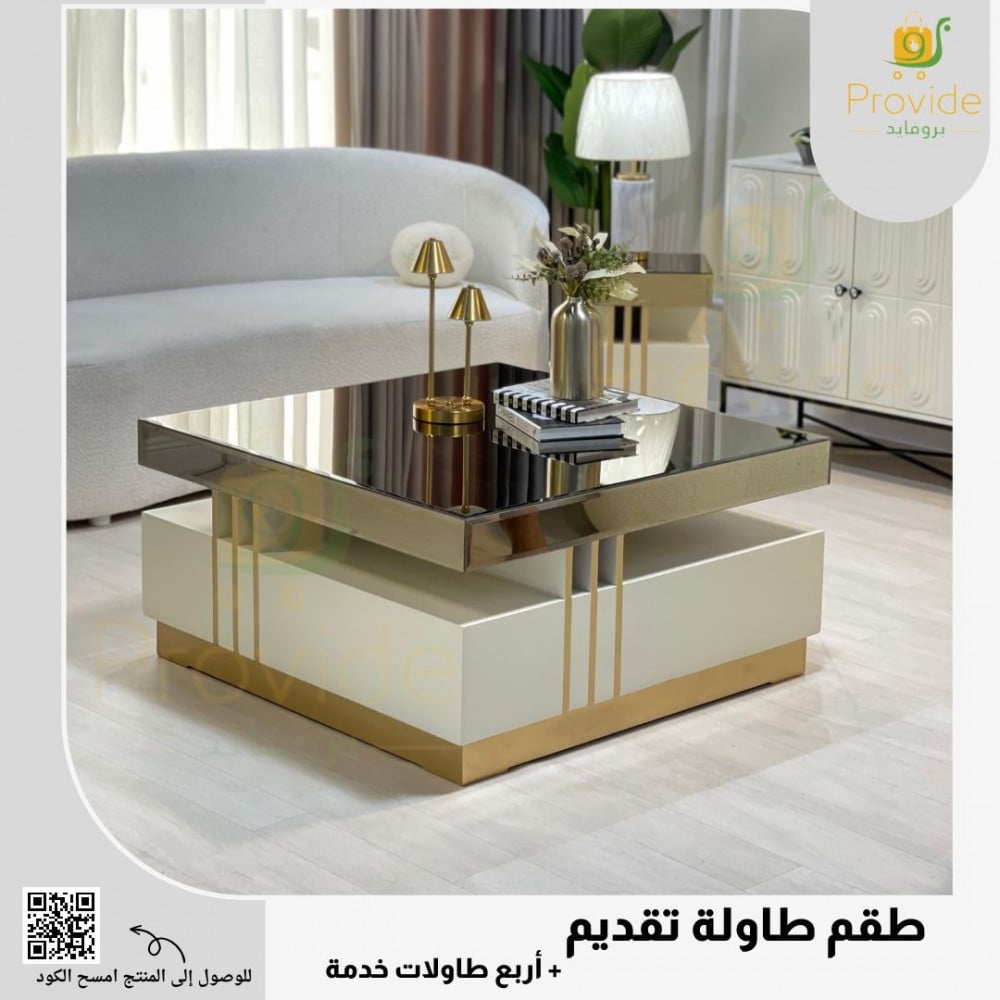 طقم طاولة تقديم فاخر يجسد الأناقة العصرية مع لمسة من الفخامة المتألقة. يتكون الطقم من طاولة رئيسية بتصميم مربع لامع، تعكس الألوان الذهبية المتداخلة مع الأبيض بريقًا رائعًا يضيف إشراقة إلى منزلك. الطاولة الرئيسية تأتي بأبعاد مثالية تجعلها قطعة مركزية لغرفة المعيشة، مناسبة للجلسات العائلية أو استقبال الضيوف. كما يضم الطقم أربع طاولات خدمة مدمجة، تتناسب مع الاحتياجات المتنوعة وتوفر مساحة مرنة يمكن استخدامها بسهولة عند استضافة الأصدقاء أو العائلة.