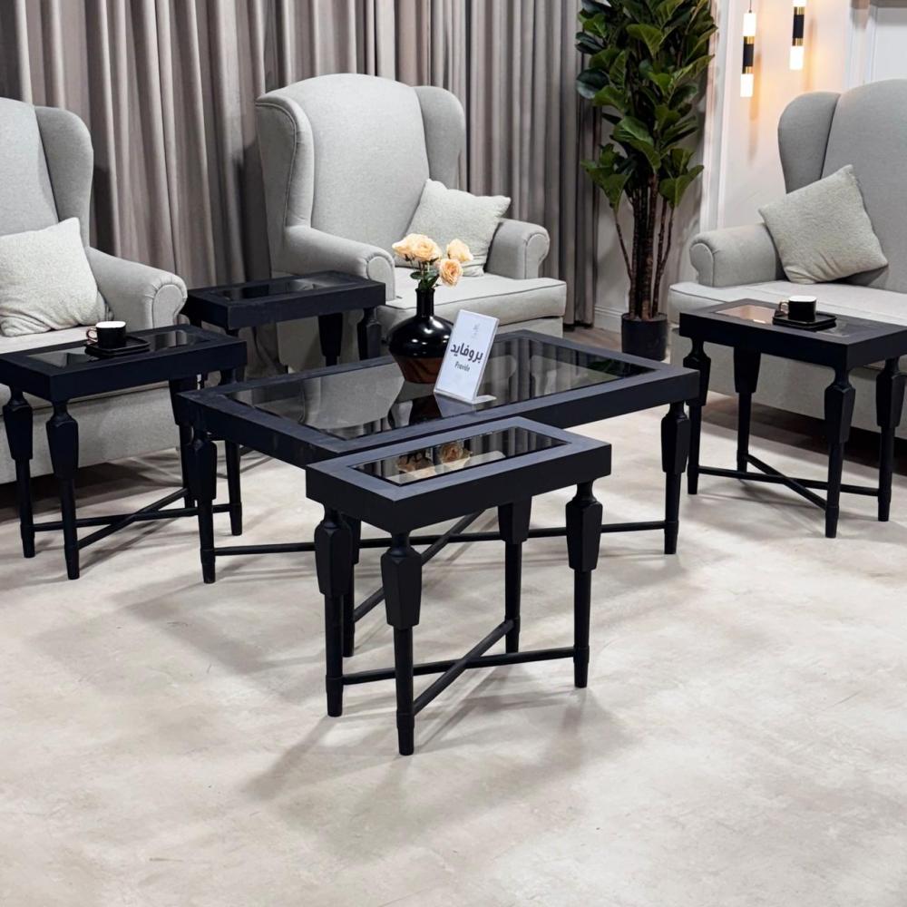 - أربع طاولات خدمة صغيرة بأحجام مختلفة، بنفس التصميم والإطار الزجاجي.