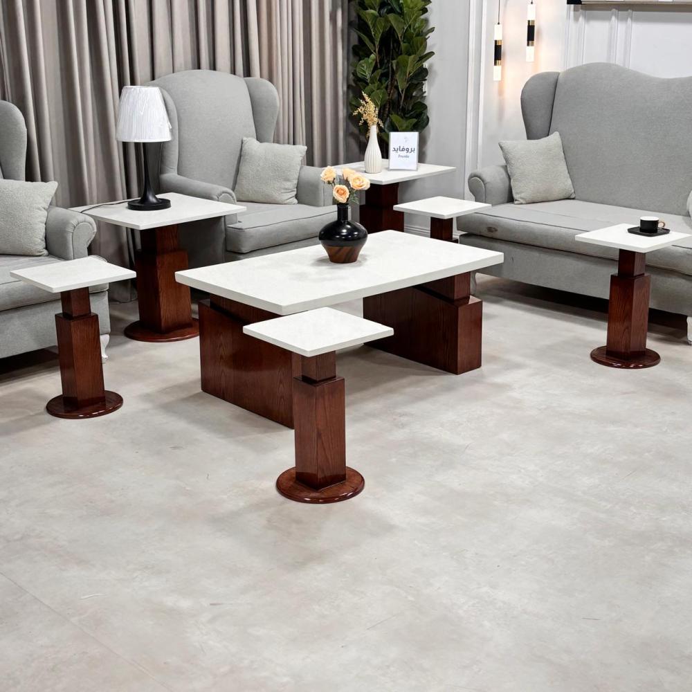طقم الطاولات في الصورة يتميز بتصميم عصري وأنيق، ويتكون من عدة طاولات مختلفة الأحجام: