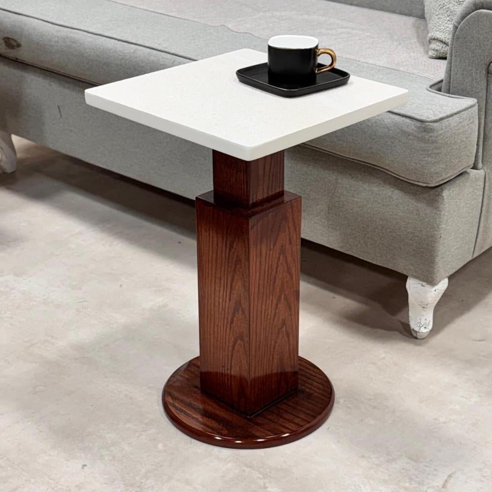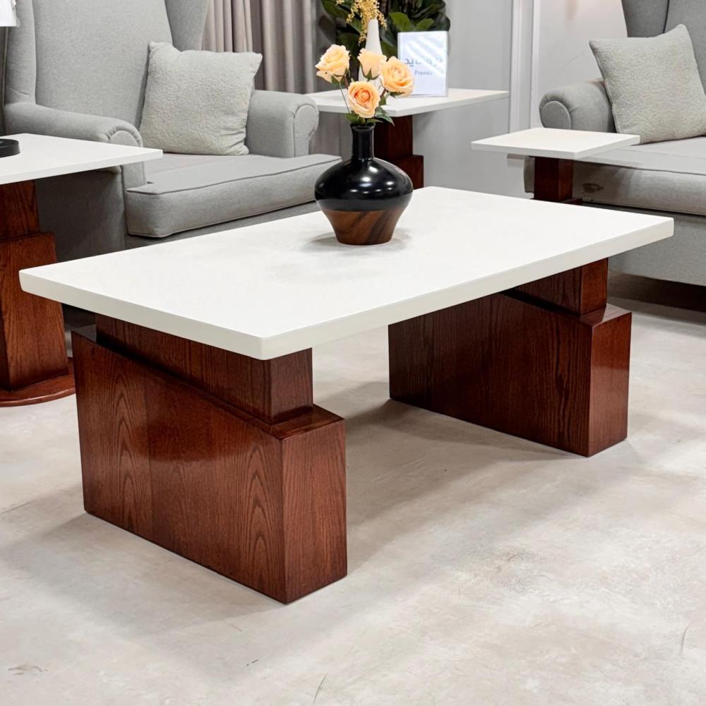 - طاولة وسط كبيرة: مستطيلة الشكل، بسطح باللون الأبيض (يبدو كابديل لرخام أو مادة لامعة مشابهة)، وقاعدة خشبية باللون البني الغامق، مصممة بشكل مكعب ضخم يمنحها ثباتاً وأناقة.