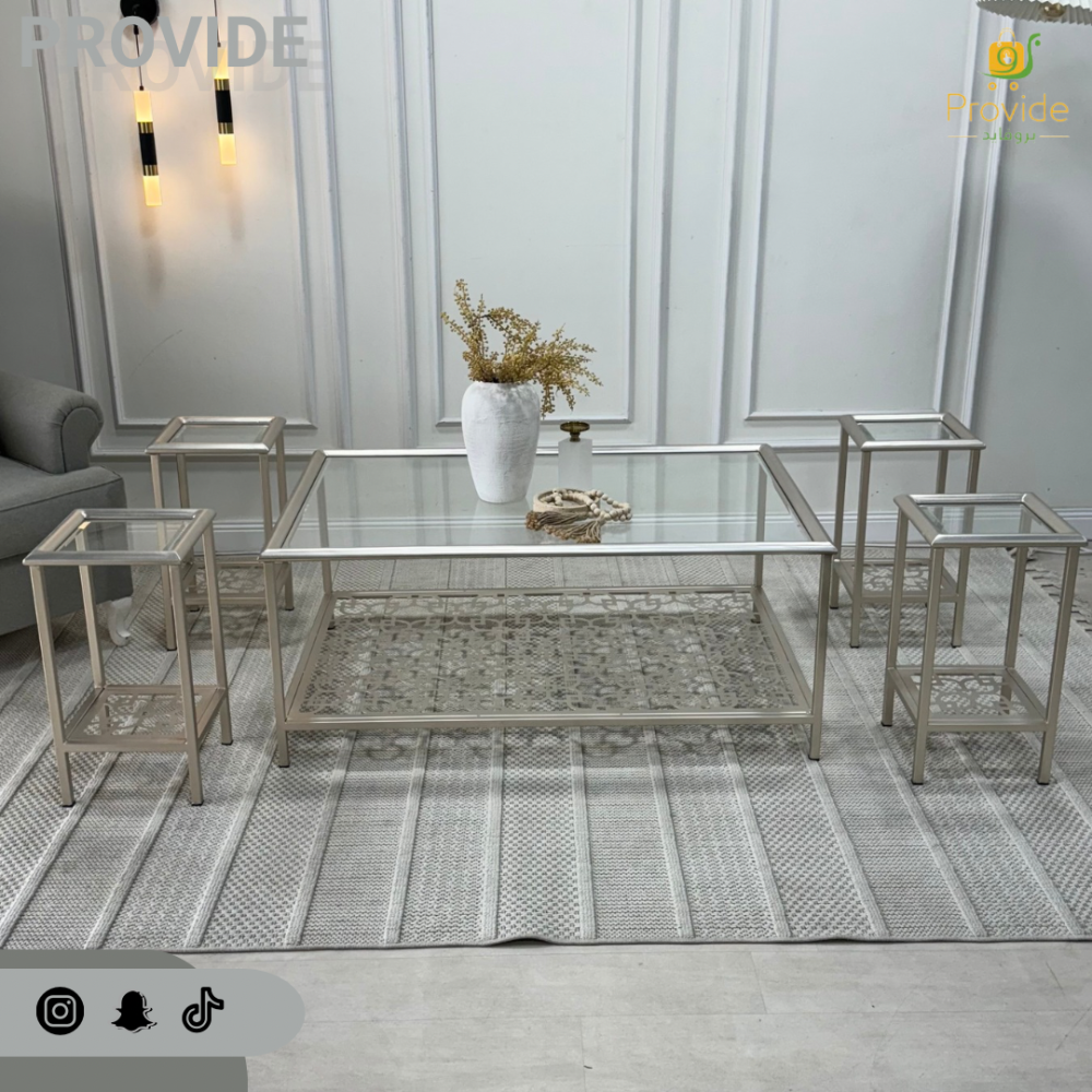 أضف لمسة من الفخامة والعملية إلى غرفة المعيشة مع طقم طاولات التقديم المميز. يتميز الطقم بطاولة رئيسية بسطح زجاجي شفاف وهيكل معدني أنيق، بالإضافة إلى أربع طاولات خدمة صغيرة، مما يتيح لك حرية التوزيع والاستخدام حسب احتياجاتك. تصميمها العصري يجعلها مناسبة لأي ديكور، لتكون نقطة محورية تجمع بين الجمال والوظائف.