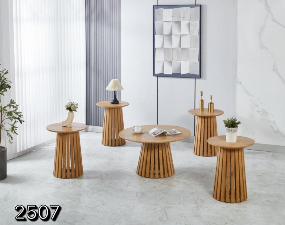 طقم طاولات تقديم أنيق يجمع بين العملية والأناقة، يتكون من طاولة رئيسية مع أربع طاولات خدمة صغيرة. مصمم بسطح خشبي دائري وقاعدة خشبية بتصميم أعمدة عمودية، مما يمنح القطع استقرارًا ومظهرًا فريدًا وأنيقًا. هذا الطقم مثالي لإضافة لمسة من الفخامة إلى غرفة المعيشة أو استقبال الضيوف، حيث يمتزج بسهولة مع الديكورات المختلفة بفضل تصميمه البسيط والراقي.