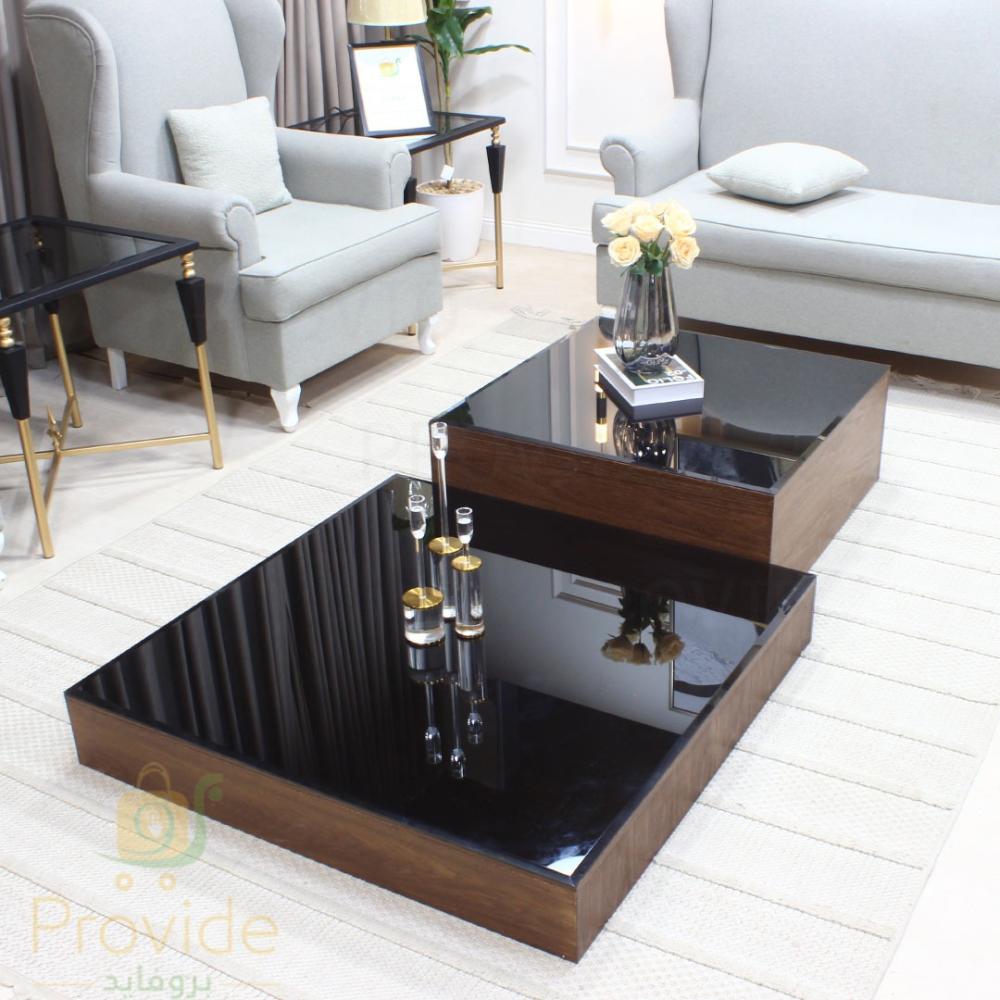 طقم طاولات تقديم بتصميم عصري وأنيق، يتميز بسطح زجاجي أسود لامع يعكس الإضاءة بشكل فاخر، مع قاعدة بلون خشبي طبيعي تضيف دفء وأناقة للمكان. يتكوّن الطقم من قطعتين بأحجام متفاوتة يمكن تنسيقهما معًا بسهولة لتمنح لمسة فخمة وعملية لغرفة المعيشة.