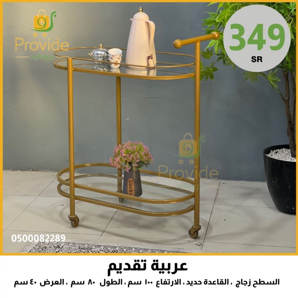 الصورة تُظهر عربية تقديم بتصميم بيضاوي فاخر بلون ذهبي من متجر Provide، وهي مناسبة لمحبي التفاصيل الراقية والمظهر العصري المميز.