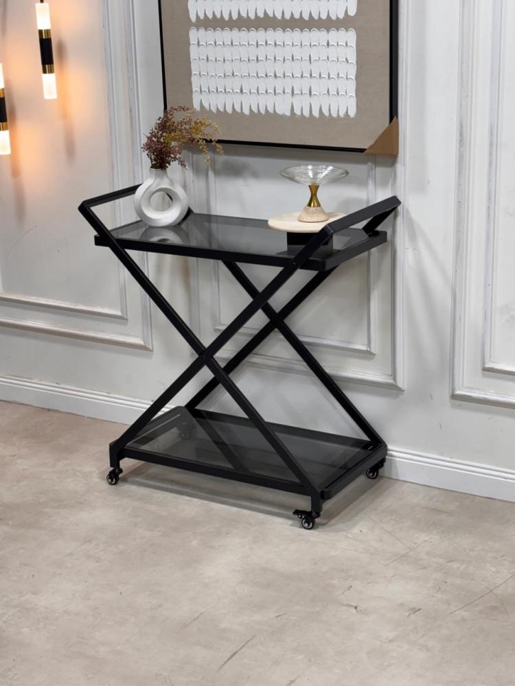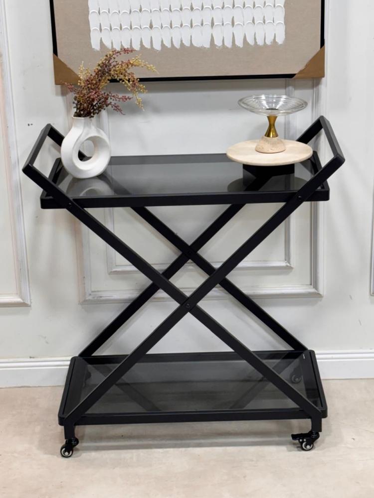 مصنوعة من هيكل معدني أسود مطفي يجمع بين القوة والانسيابية، مع رفّين من الزجاج المدخّن لتوفير مساحة عملية لترتيب أدوات الضيافة أو المشروبات أو قطع الديكور.