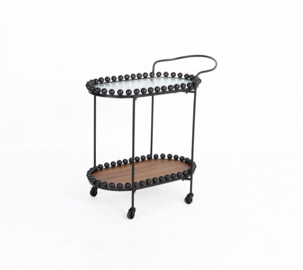 عربة تقديم بيضاوية الشكل بتصميم أنيق وجريء، تُستخدم لتقديم الضيافة أو كعنصر ديكور متنقل داخل المنزل، وتمتاز بلمسات زخرفية تلفت الأنظار.