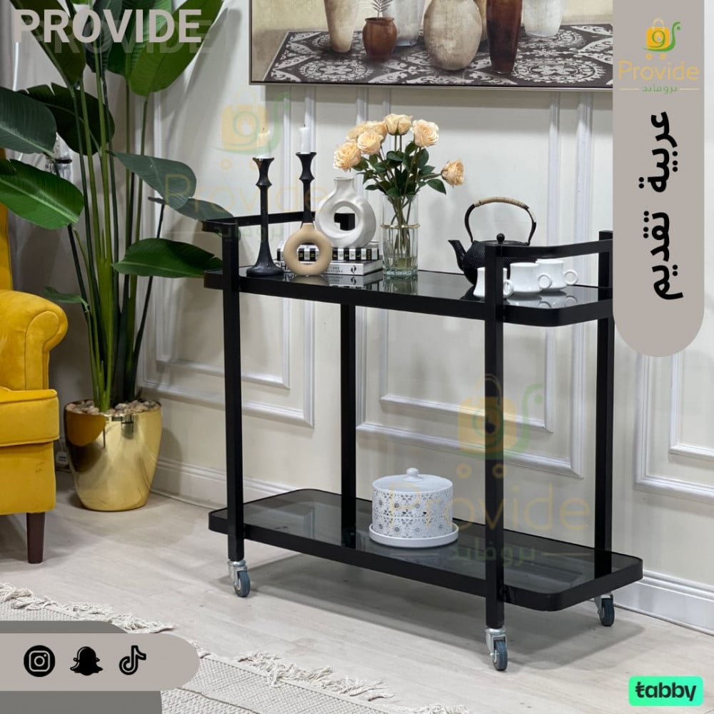 عربة تقديم أنيقة وعملية تتميز بتصميم بسيط وعصري مع سطحين مستطيليين باللون الأسود اللامع، مما يضفي لمسة فخمة على أي مكان توضع فيه. الإطار المعدني المتين يوفر استقرارًا عاليًا، مع وجود عجلات دوارة تضمن سهولة النقل والتحرك بين الغرف.