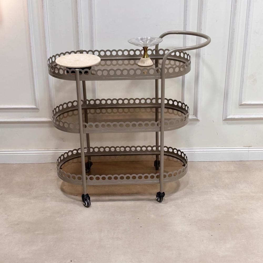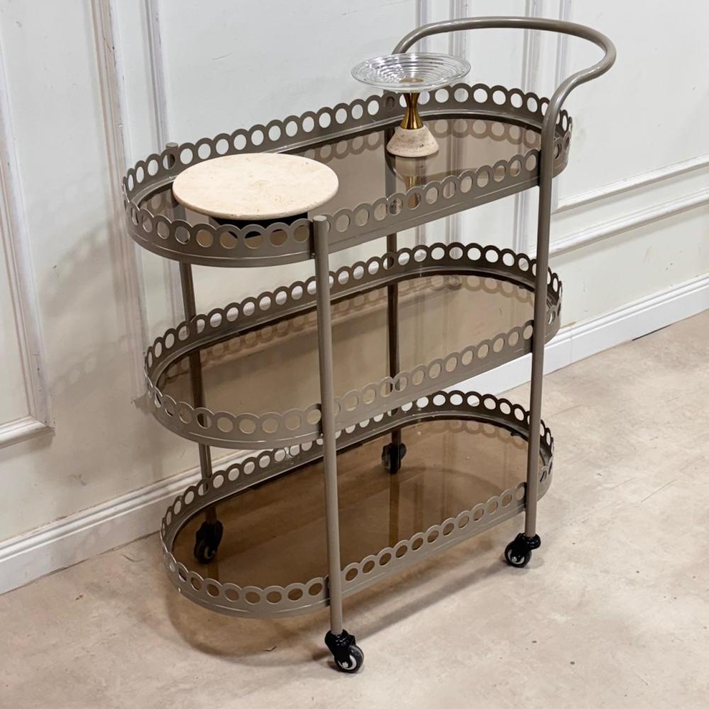 الصورة تُظهر عربة تقديم بثلاثة رفوف بتصميم فاخر ولمسة فنية مميزة، تجمع بين الأناقة الكلاسيكية والطابع العصري، مثالية للمساحات الراقية.
