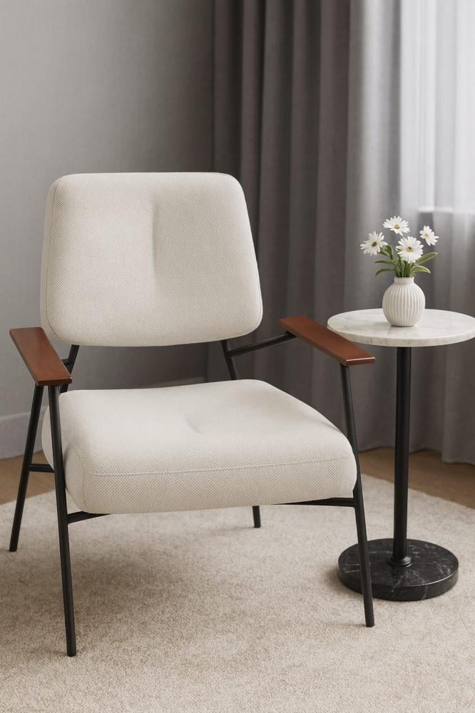 كرسي أنيق بلمسة عصرية يجمع بين الراحة والتصميم البسيط. يتميز بتنجيد فاخر بلون بيج فاتح يمنح إحساساً بالدفء والهدوء، مع مساند يد خشبية تضيف لمسة طبيعية أنيقة. القاعدة والإطار معدني باللون الأسود ليمنح ثباتاً وقوة مع شكل انسيابي عصري. قطعة مثالية لغرف المعيشة أو الزوايا الهادئة، حيث يضيف لمسة فاخرة مع توفير أقصى درجات الراحة.