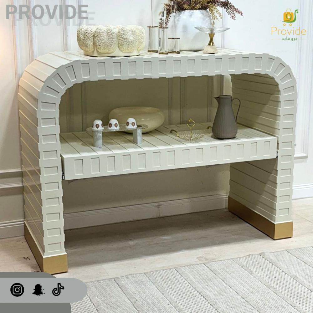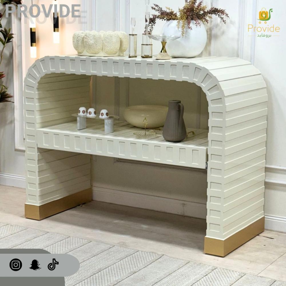 طاولة مدخل أنيقة بتصميم عصري ومميز على شكل قوس، تأتي بلون بيج هادئ وقاعدة سفلية باللون الذهبي الفاخر. تحتوي الطاولة على رفّ إضافي لتوفير مساحة تخزين وعرض مثالية للديكورات أو الأغراض اليومية. مصنوعة من مواد عالية الجودة، لتضفي لمسة جمالية وعملية على مدخل منزلك أو أي مساحة داخلية.