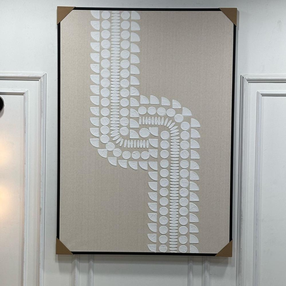 اللوحة ذات خلفية قماشية بلون بيج فاتح، مرسوم عليها نقوش هندسية متكررة باللون الأبيض. التصميم يعتمد على أشكال نصف دائرية وأخرى شبيهة بالأوراق، مرتبة بشكل متناسق لتكوين مسارين متداخلين بطريقة فنية أنيقة.