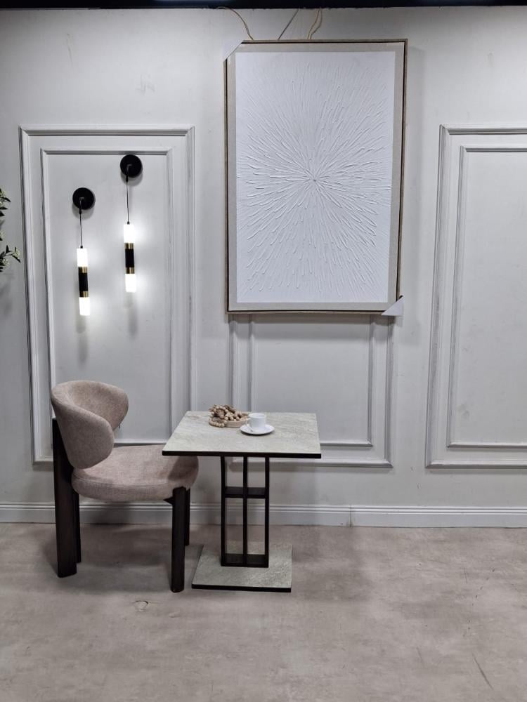 اللوحة تعتمد على البساطة والملمس بدلاً من الألوان، لتمنح المكان طابعًا عصريًا وهادئًا.