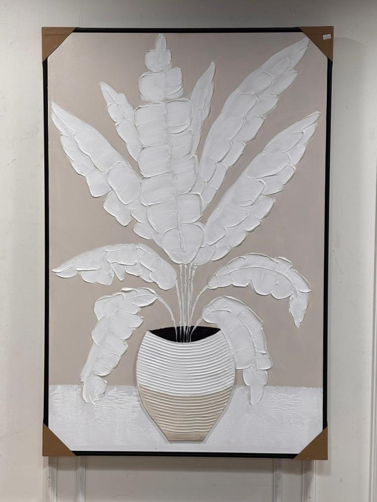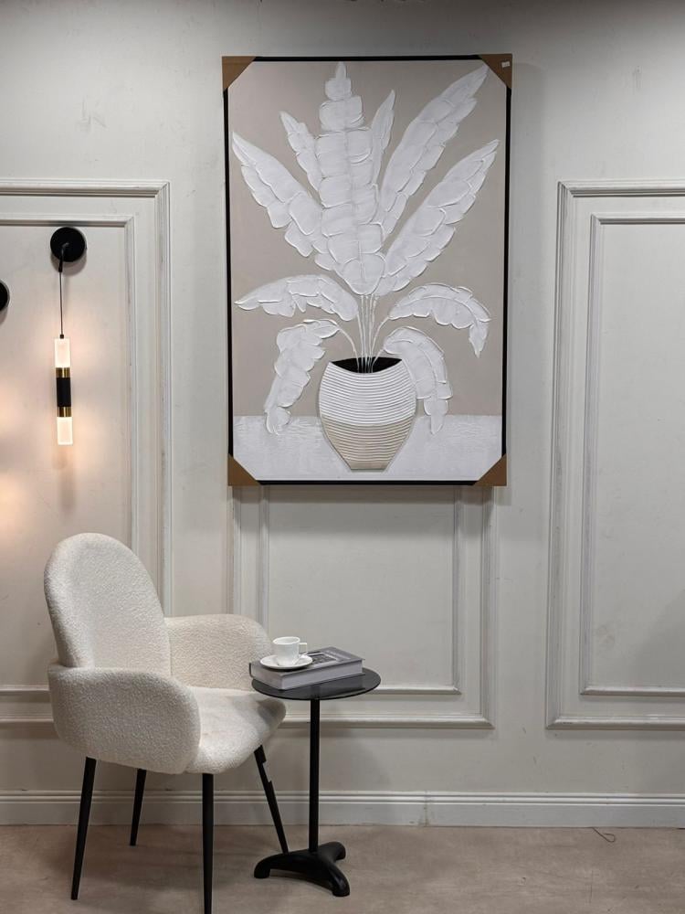 • الوصف: اللوحة مرسومة بتقنية بارزة (ثري دي) حيث يظهر شكل نبات كبير بأوراق طويلة باللون الأبيض، موضوع داخل مزهرية أنيقة بخطوط أفقية بارزة. الخلفية بلون بيج هادئ يضيف لمسة عصرية وبسيطة.