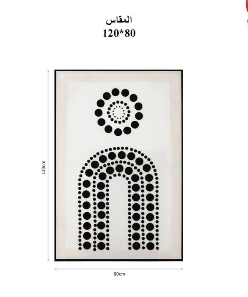 - الوصف: اللوحة تحتوي على خلفية بلون فاتح مع أشكال هندسية مكوّنة من نقاط سوداء متفاوتة الحجم. في الجزء العلوي يوجد تشكيل دائري من النقاط يشبه الشمس أو الهلال الدائري، بينما في الجزء السفلي يظهر قوس مزدوج مكوّن من صفوف من النقاط السوداء بأحجام مختلفة، مما يمنح اللوحة طابعًا بصريًا جذابًا.