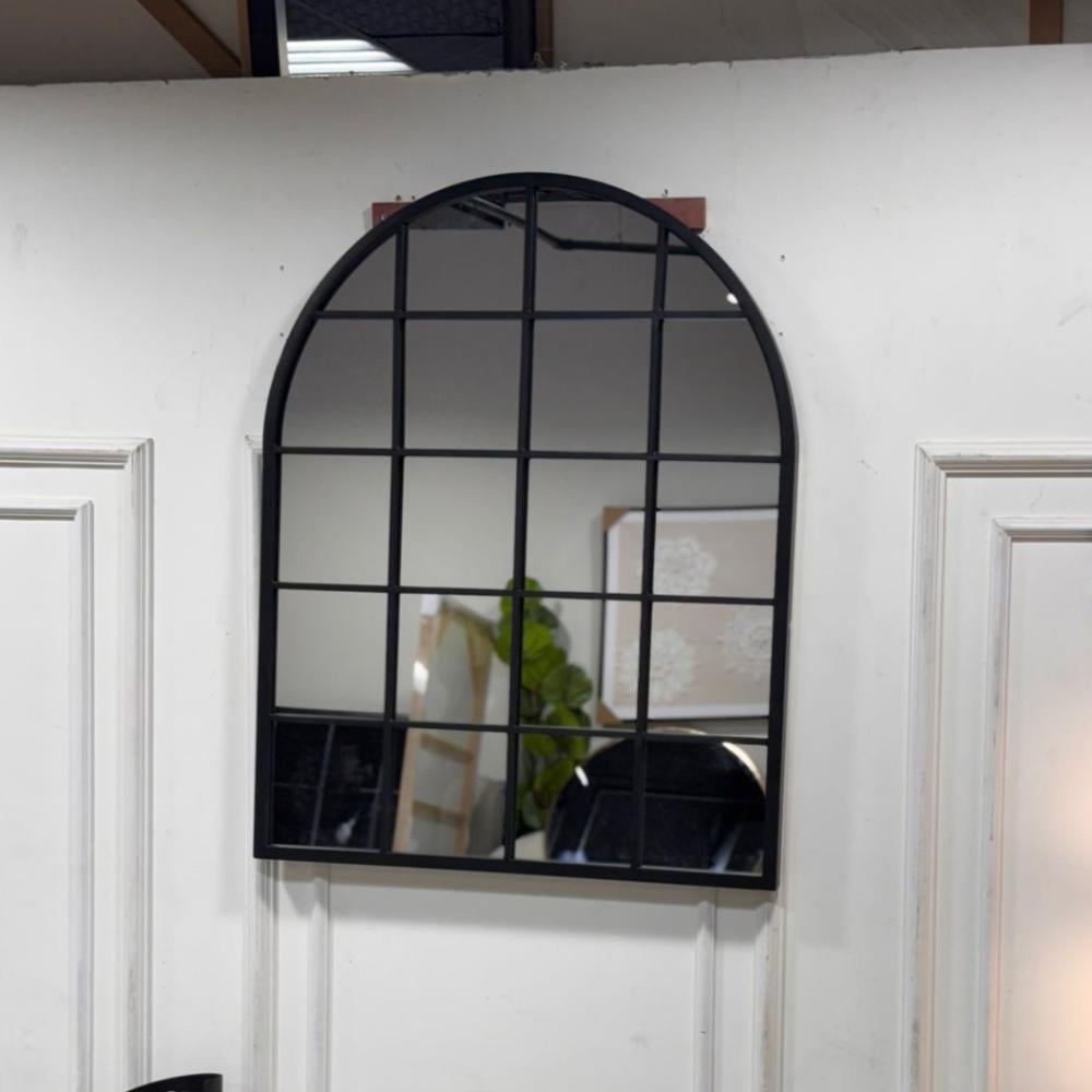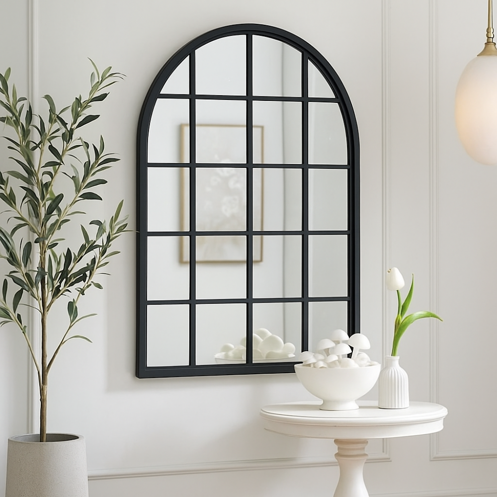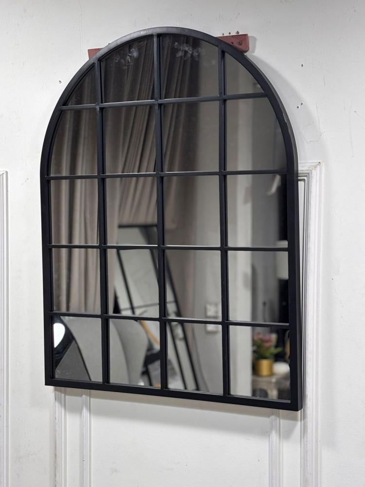 مرآة حائط بتصميم عصري أنيق، تأتي بإطار معدني باللون الأسود غير اللامع، بتفاصيل مقسّمة إلى مربعات تضفي لمسة هندسية جذّابة.