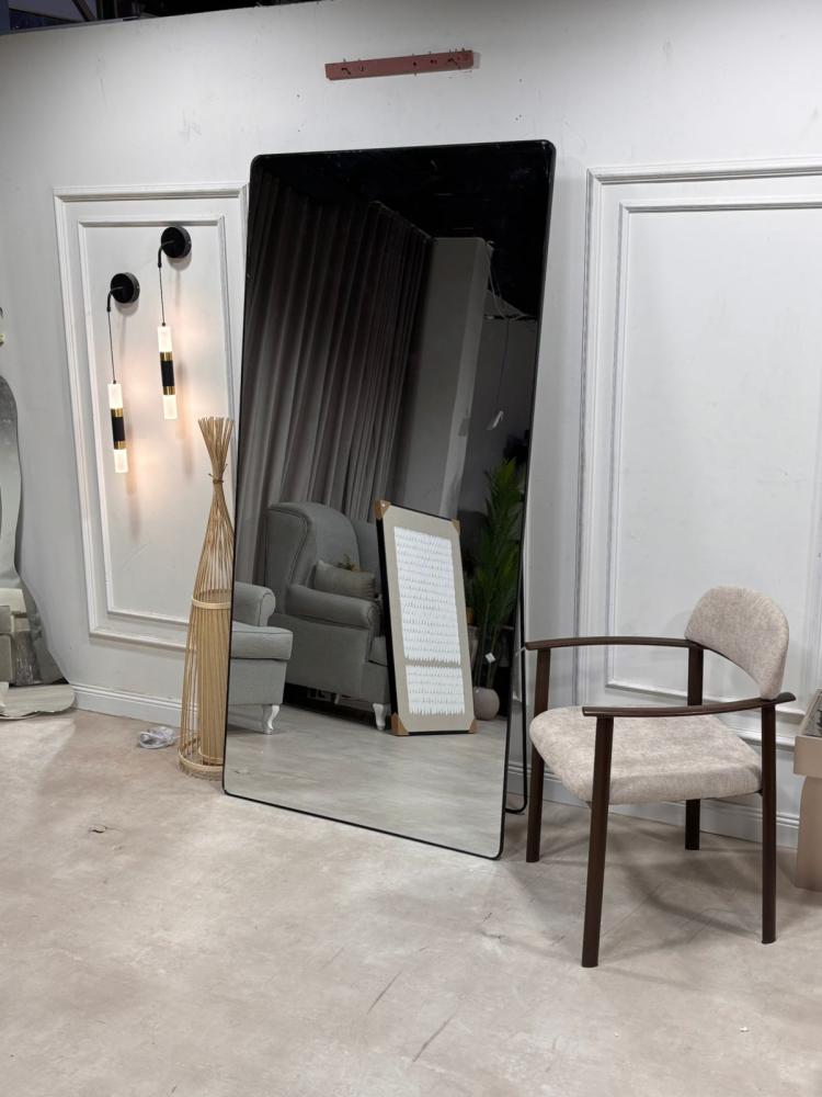 - الوصف: المرآة مستطيلة بإطار رفيع أسود معدني يمنحها لمسة عصرية بسيطة، مع سطح عاكس نقي يعطي إحساساً بالاتساع والعمق في المكان. يمكن إسنادها على الحائط لإضفاء فخامة على الغرفة، أو تثبيتها لتوفير أمان أكثر.